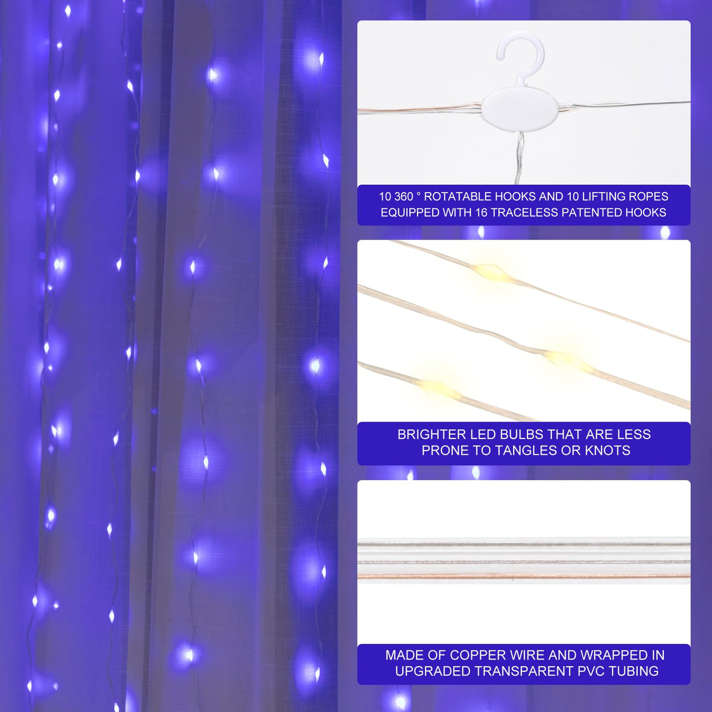 Q: How many lighting modes does this curtain light have?A: This curtain light features 8 different lighting modes, including combination, in waves, sequential, slogs, chasing/flash, slow fade, twinkle/flash, and steady on, allowing you to customize your ambiance.