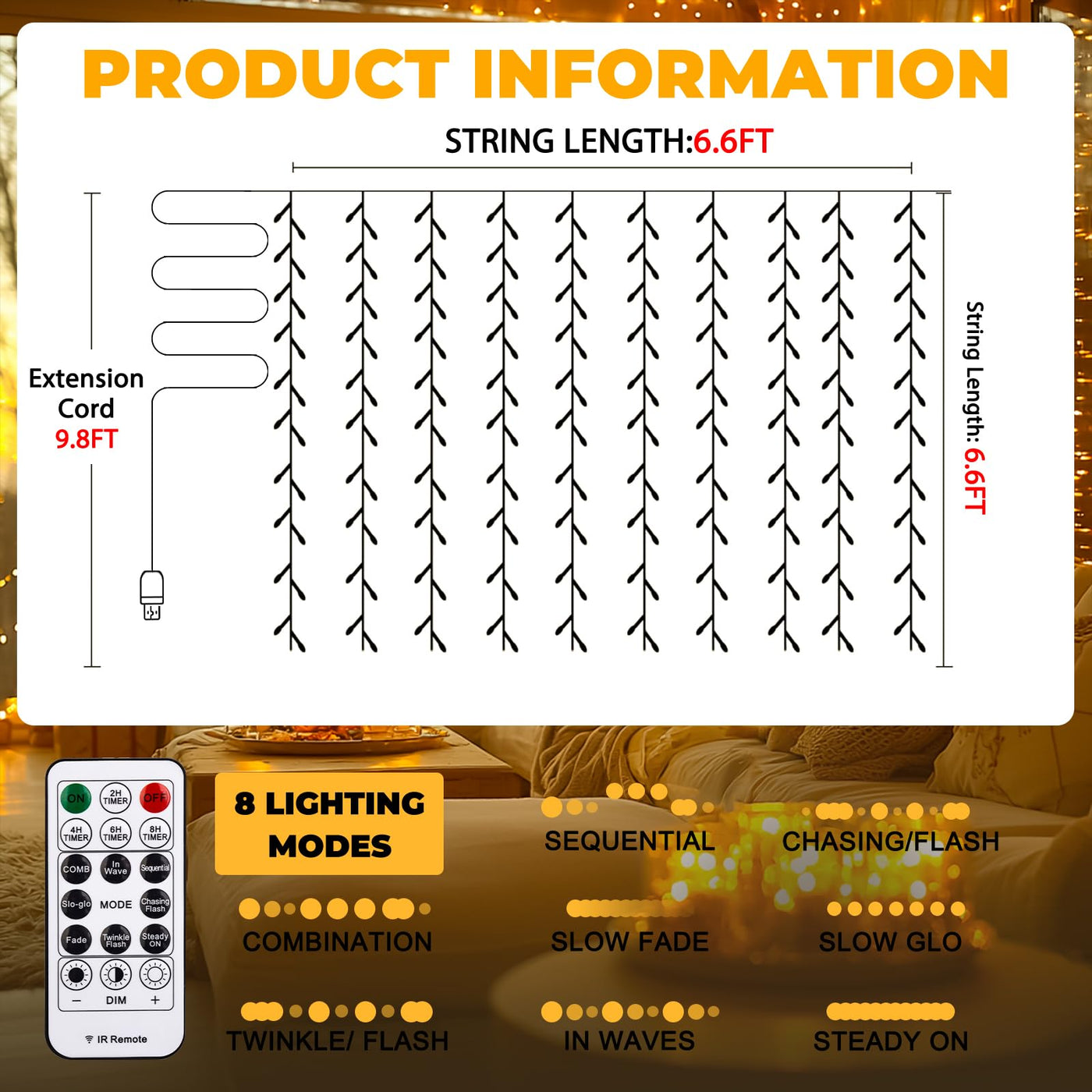 Q: What are the different lighting modes available for the SINAMER Curtain Light?A: The SINAMER Curtain Light features 8 different lighting modes, including combination, waves, sequential, slow glow, chasing/flash, slow fade, twinkle/flash, and steady on. This variety allows you to create a unique romantic ambiance for different occasions.