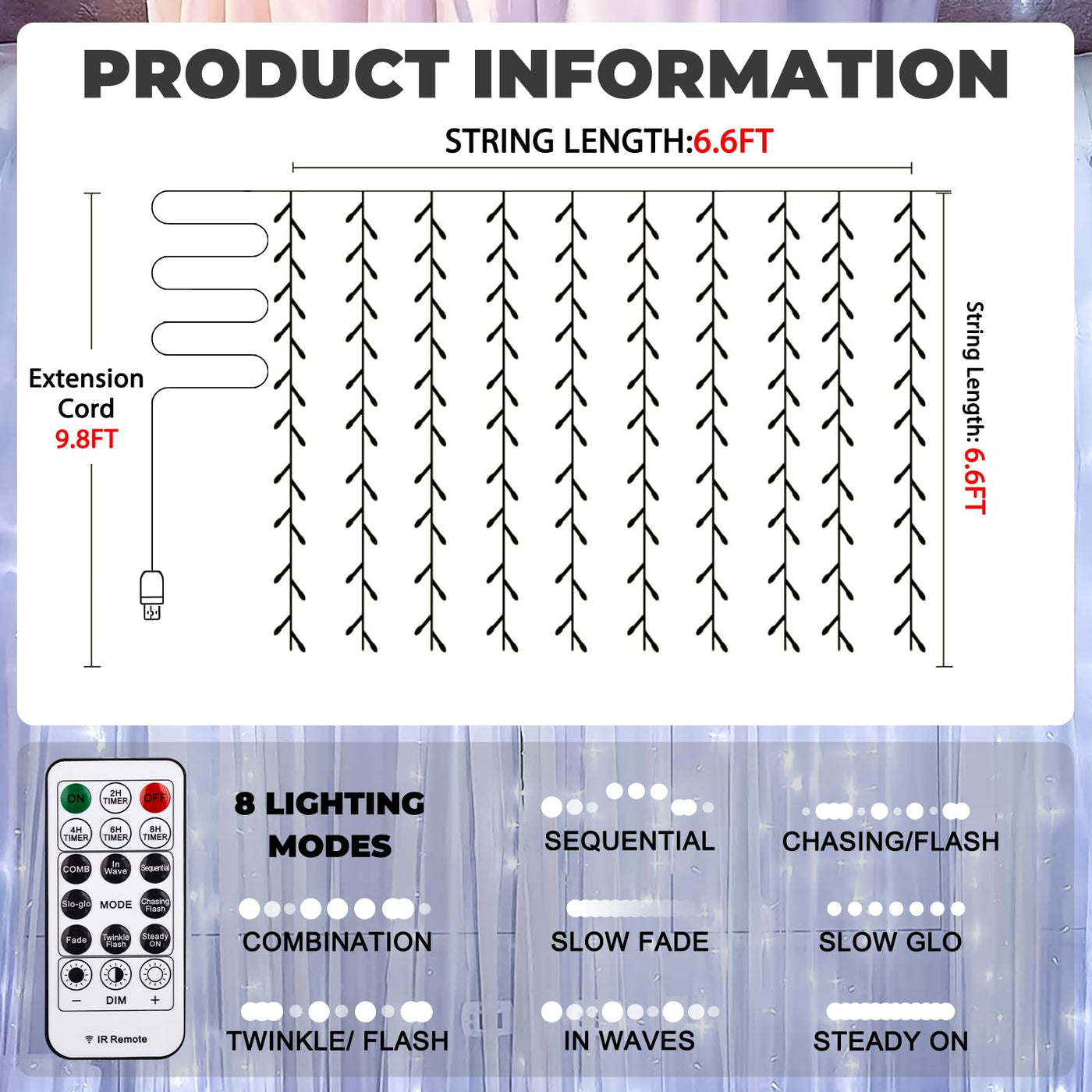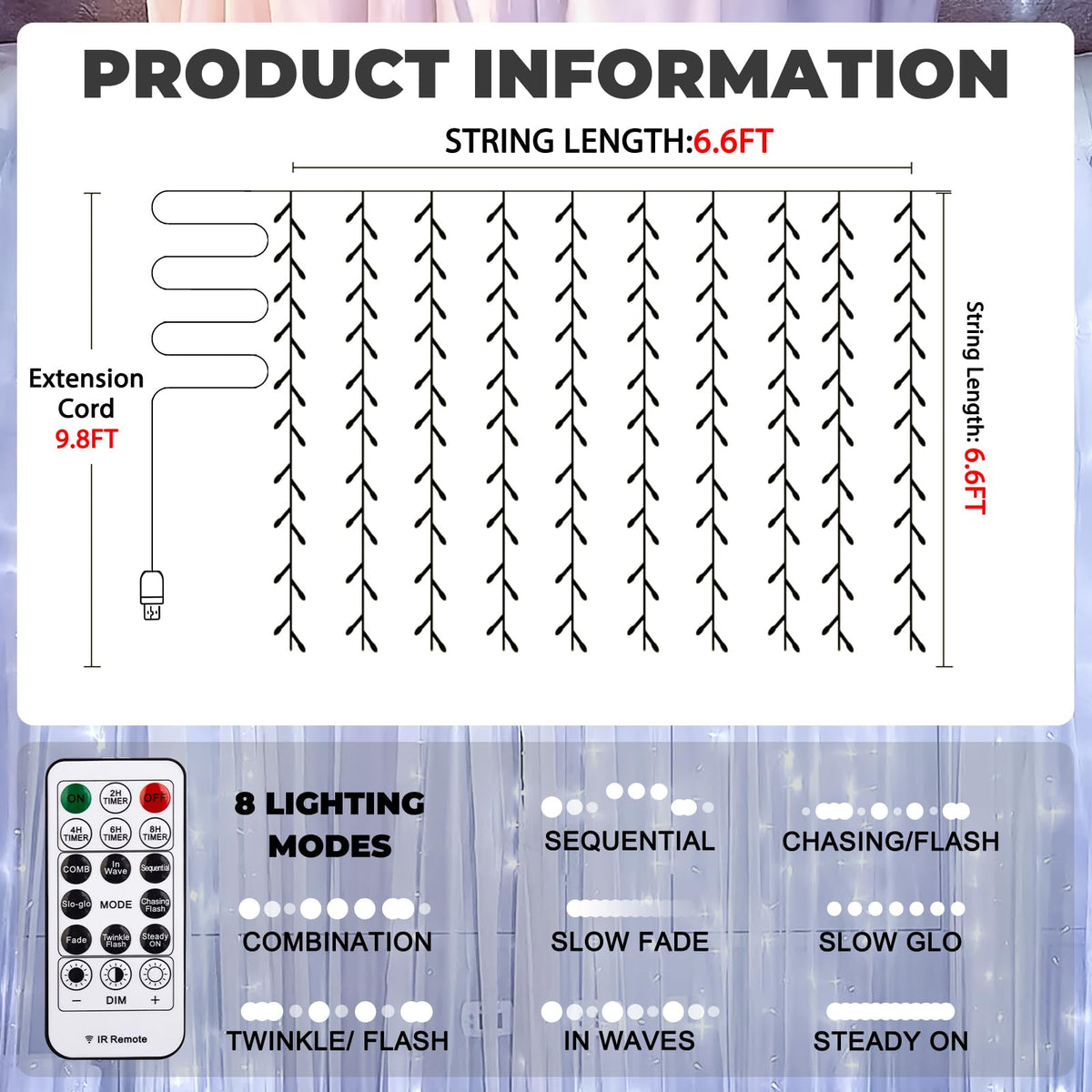 Q: What are the different lighting modes available for the SINAMER Curtain Light?A: The SINAMER Curtain Light features 8 unique lighting modes, including combination, waves, sequential, slow glow, chasing/flash, slow fade, twinkle/flash, and steady on. These modes allow you to create a romantic ambiance suitable for various occasions.