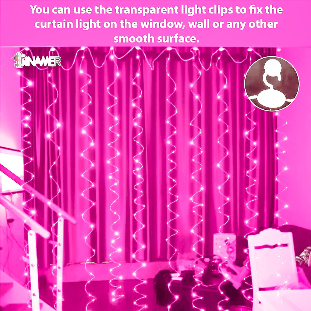 Sinamer Pink Curtain Light For Bedroom, 300 Led 9.8Ft X 9.8Ft Window Fairy Curtain String Light With 16 Hooks, 8 Models Remote Control For Wedding Party Home Garden Indoor Decorations