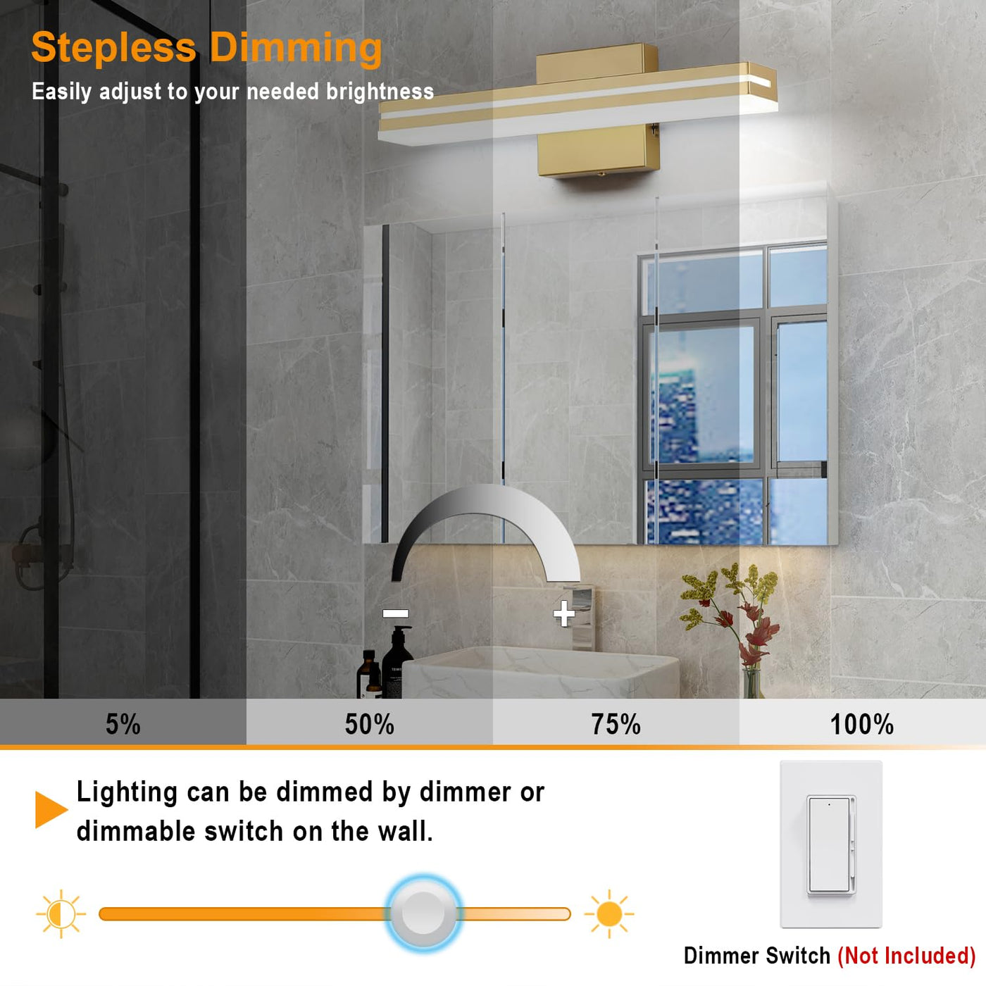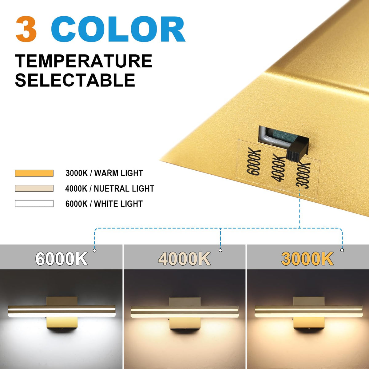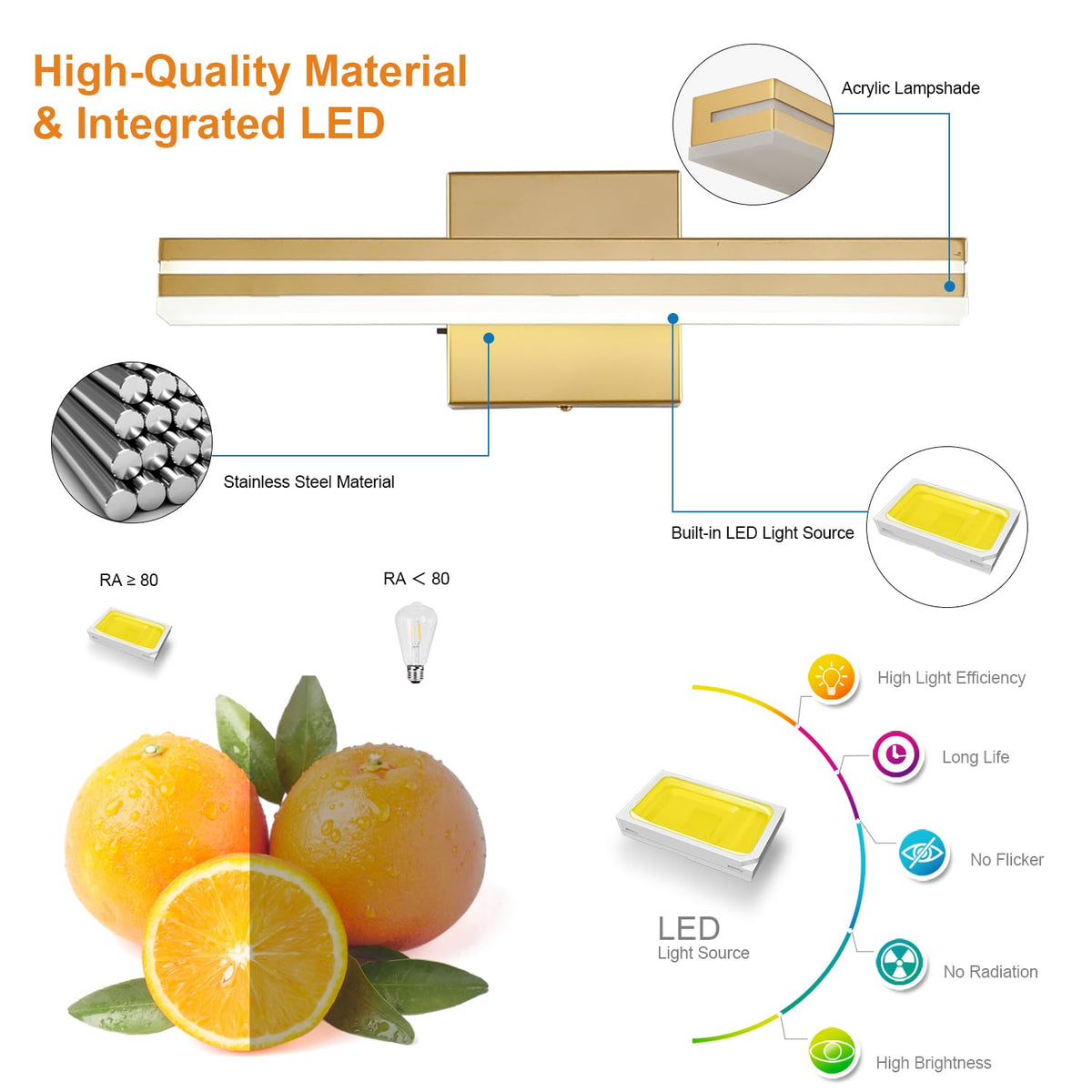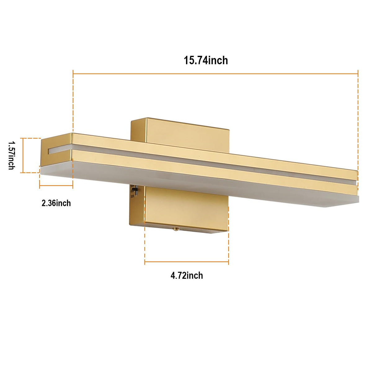 ?Material?Metal Gold Frame with advanced electroplate craft and sealing technology, dust-proof, fog-proof, anti-corrosion and moisture-proof, suitable for humid environment. Frosted White Solid Acrylic Lampshade is rugged, durable and unbreakable, provides excellent down lighting without glare. Gives a great contemporary look to your master bathroom. | ?Energy Saving?15W LED Vanity Light. Although only 15W, but gives off great lighting brightness more than ordinary 80W bulbs. Environmentally friendly and save more electricity. | ?3 Color Temperature Options?You can control which color temperature your lights are and the overall ambiance of the room. 6000k is necessary for makeup application or shaving, but an evening bath will be more relaxing with 3000k or 4000k. | ?Dimmable Lighting?It