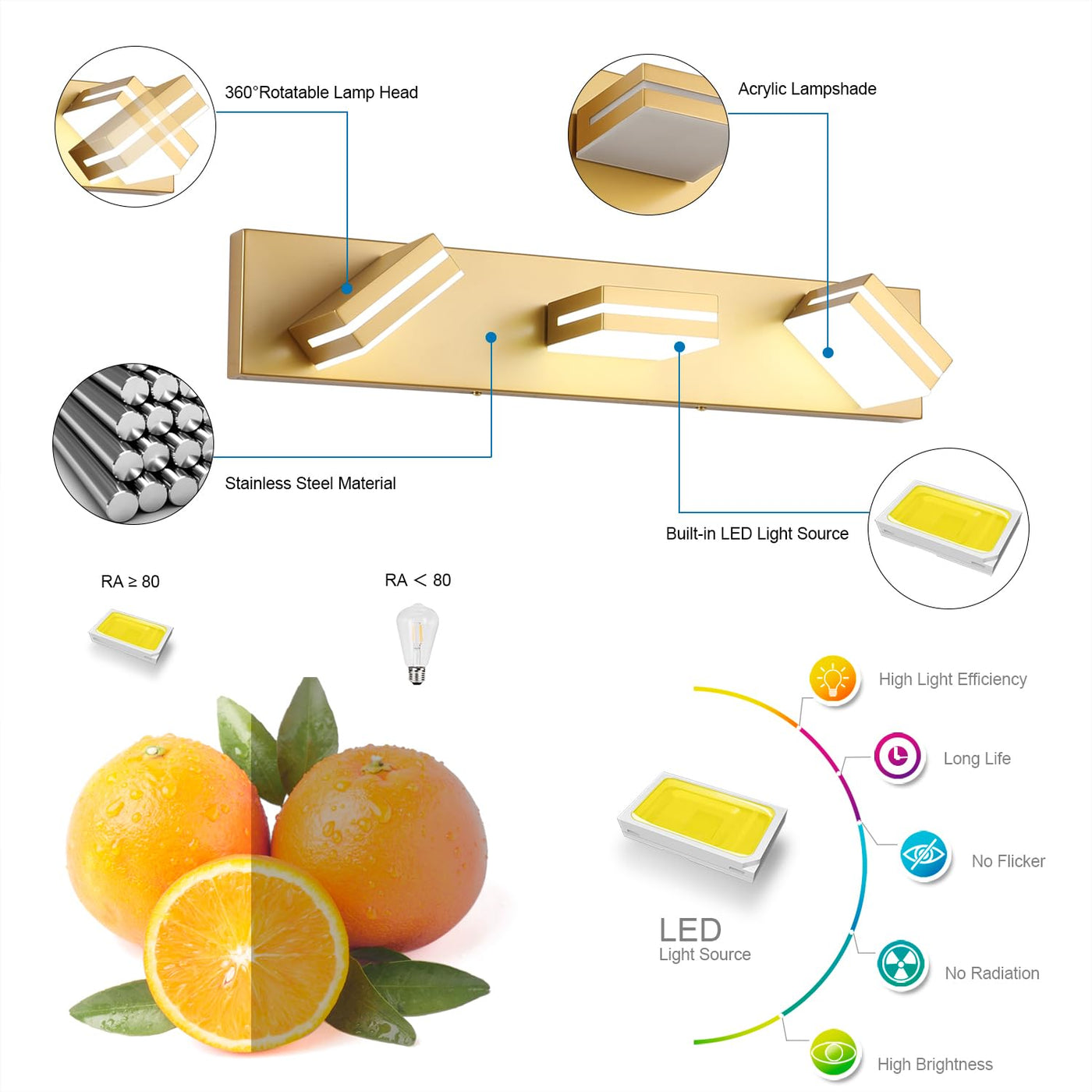 ?Material?Matte Gold Frame with advanced electroplate craft and sealing technology, dust-proof, fog-proof, anti-corrosion and moisture-proof, suitable for humid environment. Frosted White Solid Acrylic Lampshade is rugged, durable and unbreakable, provides excellent down lighting without glare. Gives a great contemporary look to your master bathroom. | ?Energy Saving?16W LED Cool White Vanity Light. Although only 16W, but gives off great lighting brightness more than ordinary 100W bulbs. Environmentally friendly and save more electricity. | ?Rotatable Lamp Design?360