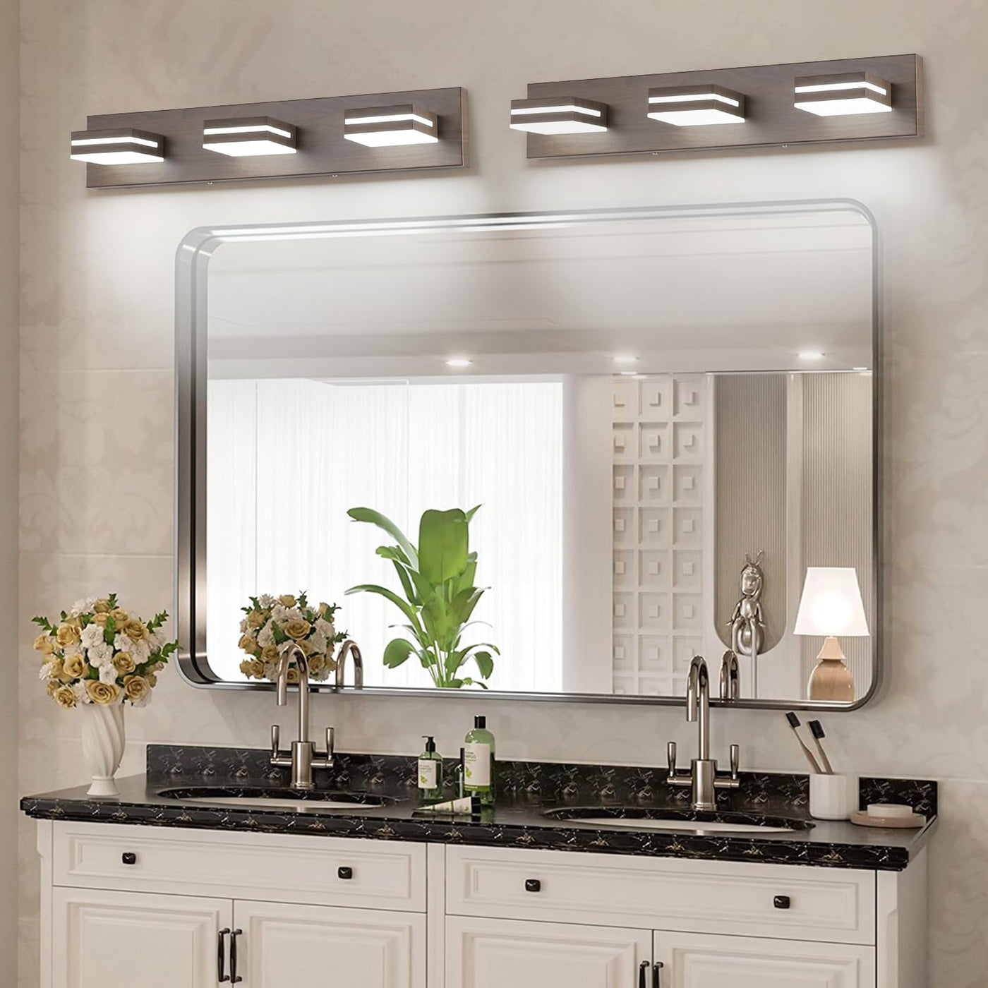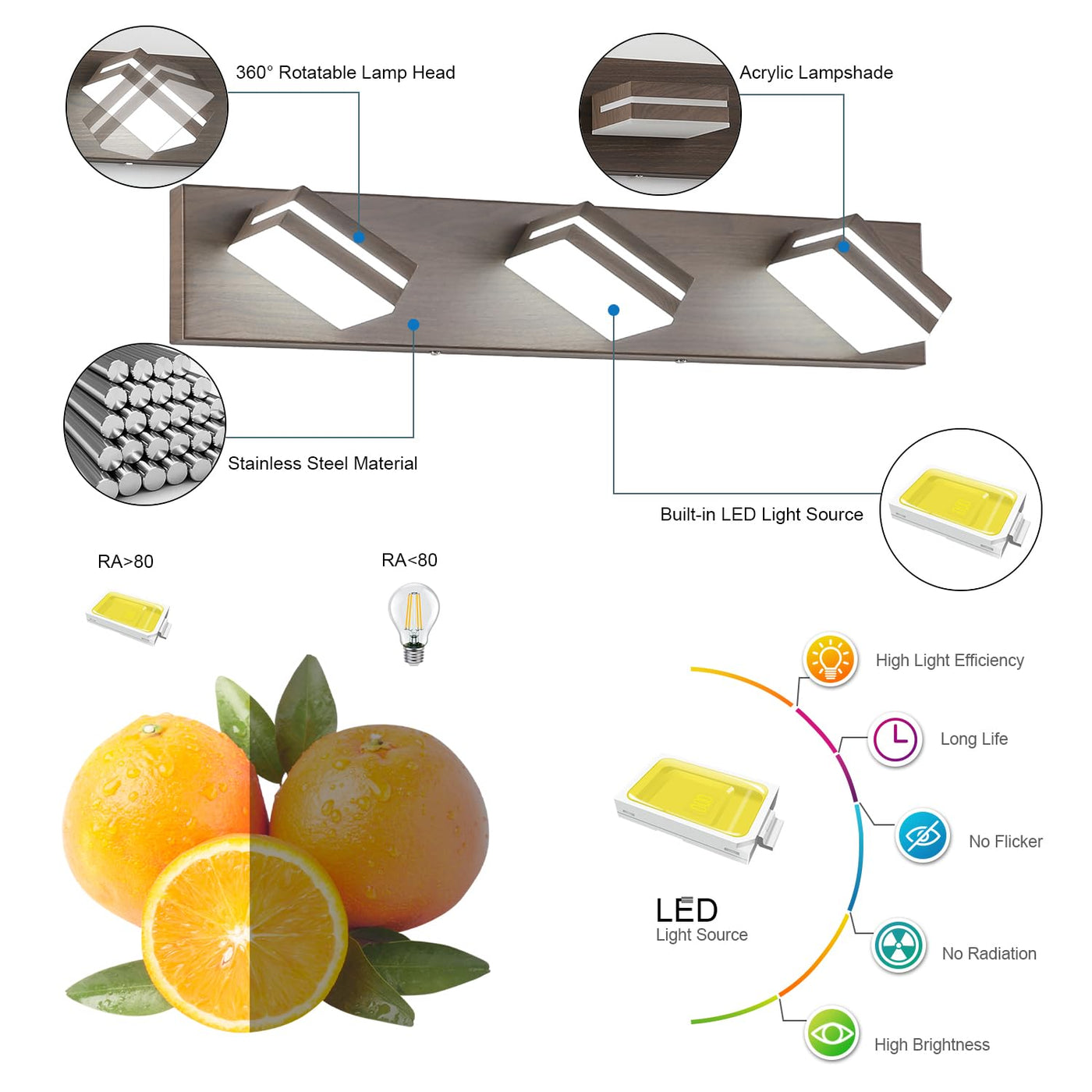 ?Material?With advanced electroplate craft and sealing technology, dust-proof, fog-proof, anti-corrosion and moisture-proof, suitable for humid environment. Frosted White Solid Acrylic Lampshade is rugged, durable and unbreakable, provides excellent down lighting without glare. Gives a great contemporary look to your master bathroom. | ?Energy Saving?24W LED Cool White Vanity Light. Although only 24W, but gives off great lighting brightness more than ordinary 120W bulbs. Environmentally friendly and save more electricity. | ?Rotatable Lamp Design?360