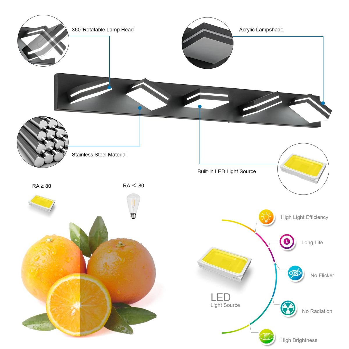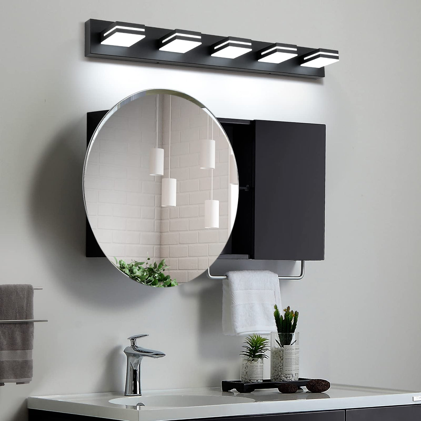 Would definitely recommend this vanity light to anyone looking for some modern vanity lighting! It is a perfect finishing touch for a modern style and provides a brilliant white light suitable for makeup application. Easy install and gives a great contemporary look to your master bath. It is very bright and creates excellent light all over the bathroom. The fixture stretches 30across with light flowing from both above and below the four acrylic lit squares. The height of the fixture is 4.5and it extends 5.3from the wall. The sleek modern appearance blends perfectly with our master bathroom. The lumen output is 2560 lumen at 6,000 kelvin (cool white light). This is plenty of light for above a standard vanity. It? suitable by itself for a small to medium sized bathroom. The light shines both above and below the acrylic blocks and is not directable. The bulbs are built in and thus can not be changed. The bulbs draw only 24W of power and produce virtually no heat. The sleek, clean lines, combination of black metal, acrylic glass and pleasant light output make this an excellent choice for a small to medium bathroom or similar installation. Specification: Lamp Body: 24(L)*5.3(W)*4.3(H) inch/60cm*13.5cm*11cm Power: 24W Input: AC 85-265V, 50/60Hz Lumens: 1596 lumens Color temperature: 6000K(Cool White Light) Ra:>80Ra Beam angle:120? Material: Matte black + Acrylic Driver type: ETL/UL Approved, Waterproof IC Driver (IP 44) Chip Type: 120pcs high quality SMD 2835 chip Light direction: Adjustable Light life:LED's offer up to 50,000 hours Energy saving: A+ Dimmable: Not Package Include: 1 x 3 Lights Non-dimmable Vanity Lights (Hardwired, no switch or plug on the fixture itself. With USA standard Installation back plate.) 1 x Manual 1 x Install Hardware