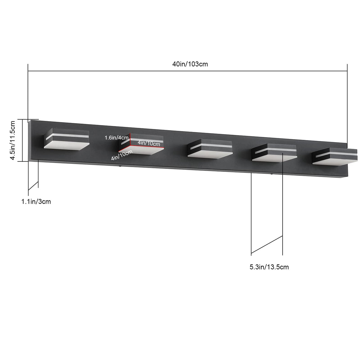 Would definitely recommend this vanity light to anyone looking for some modern vanity lighting! It is a perfect finishing touch for a modern style and provides a brilliant white light suitable for makeup application. Easy install and gives a great contemporary look to your master bath. It is very bright and creates excellent light all over the bathroom. The fixture stretches 40” across with light flowing from both above and below the five acrylic lit squares. The height of the fixture is 4.5” and it extends 5.3” from the wall. The sleek modern appearance blends perfectly with our master bathroom. The lumen output is 2560 lumen at 6,000 kelvin (cool white light). This is plenty of light for above a standard vanity. It’s suitable by itself for a small to medium sized bathroom. The light shines both above and below the acrylic blocks and is not directable. The bulbs are built in and thus can not be changed. The bulbs draw only 40W of power and produce virtually no heat. The sleek, clean lines, combination of black metal, acrylic glass and pleasant light output make this an excellent choice for a small to medium bathroom or similar installation. Specification: Lamp Body: 40(L)*5.3(W)*4.3(H) inch/103cm*13.5cm*11cm Power: 40W Input: AC 85-265V, 50/60Hz Lumens: 1596 lumens Color temperature: 6000K(Cool White Light) Ra:>80Ra Beam angle:120° Material: Matte black + Acrylic Driver type: ETL/UL Approved, Waterproof IC Driver (IP 44) Chip Type: 120pcs high quality SMD 2835 chip Light direction: Adjustable Light life:LED's offer up to 54,000 hours Energy saving: A+ Dimmable: Not Package Include: 1 x 5 Lights Non-dimmable Vanity Lights (Hardwired, no switch or plug on the fixture itself. With USA standard Installation back plate.) 1 x Manual 1 x Install Hardware