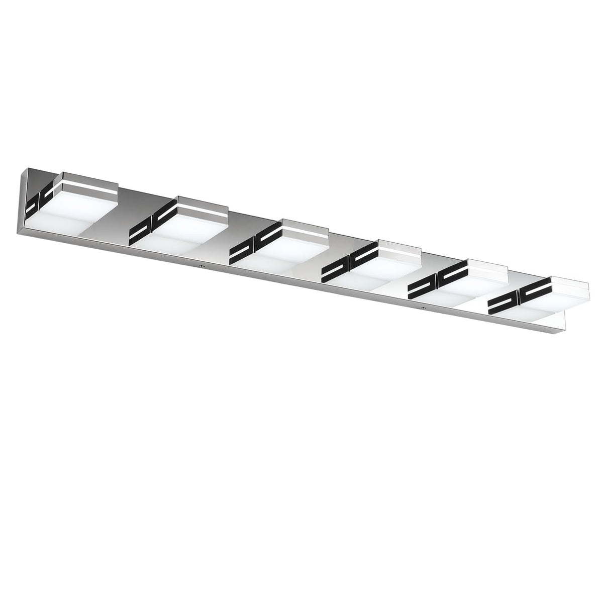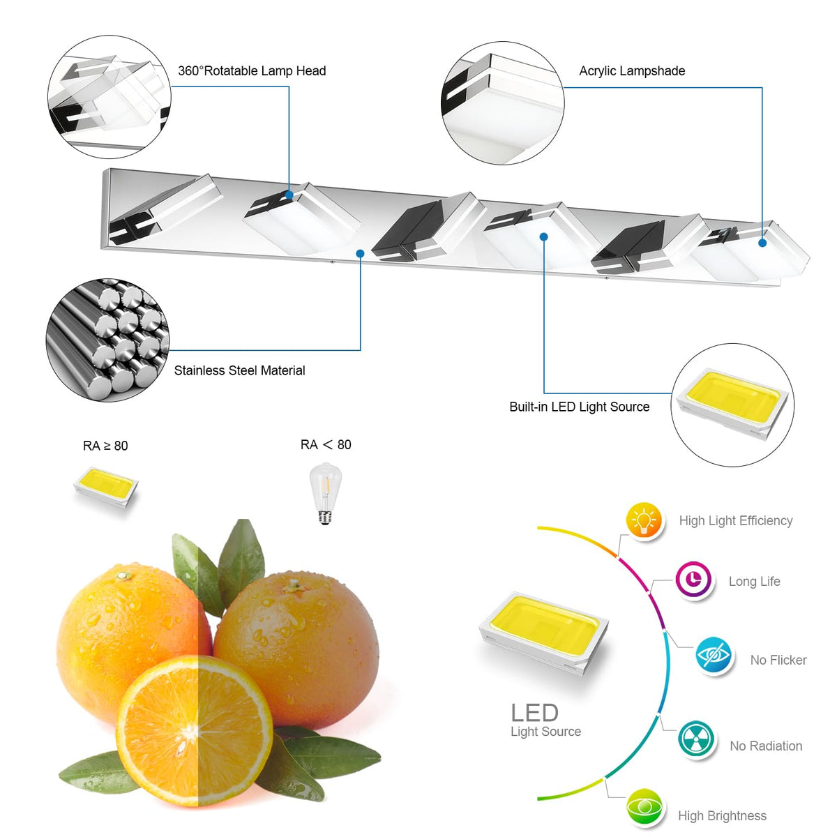?Material?With advanced electroplate craft and sealing technology, dust-proof, fog-proof, anti-corrosion and moisture-proof, suitable for humid environments. The frosted white Solid Acrylic Lampshade is rugged, durable and unbreakable, provides excellent down lighting without glare. Gives a great contemporary look to your master bathroom. | ?Energy Saving?48W LED Cool White Vanity Light. Although only 48W, but gives off great lighting brightness more than ordinary 200W bulbs. Environmentally friendly and save more electricity. | ?Rotatable Lamp Design?360? rotatable joint, can easily turn individual lights to different position if desired. The brightness is perfect for putting on makeup. | ?Dimmable & Easy to Install?This sleek and modern vanity light very easy to install. Sturdy fixture, gives off great lighting. Light is very bright with a cool color temperature and shoots it down, easily dimmable to your needed brightness, put it on a dimmer to fit your mood. | ?Safety?Quality approved power driver following ETL/UL standard, lamp fixtures parts following CE/ROHS/QCQ standard, IP44 waterproof and dust proof capacity.