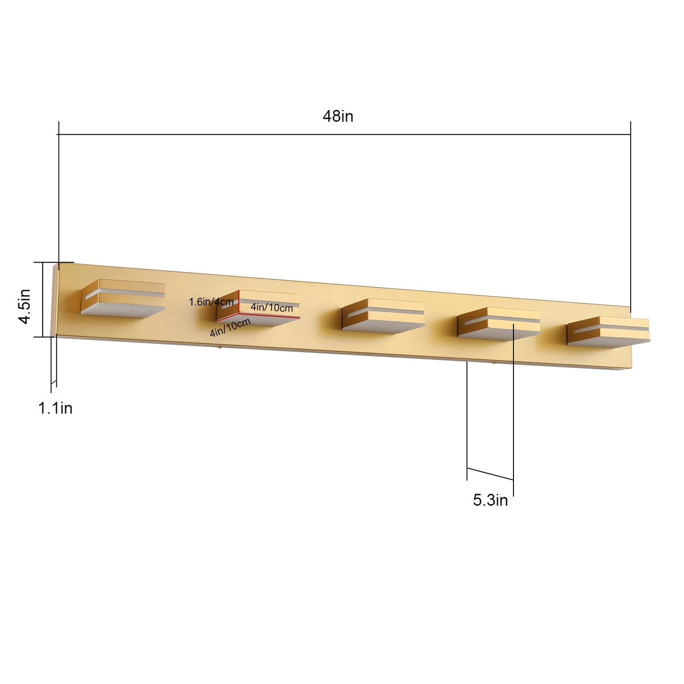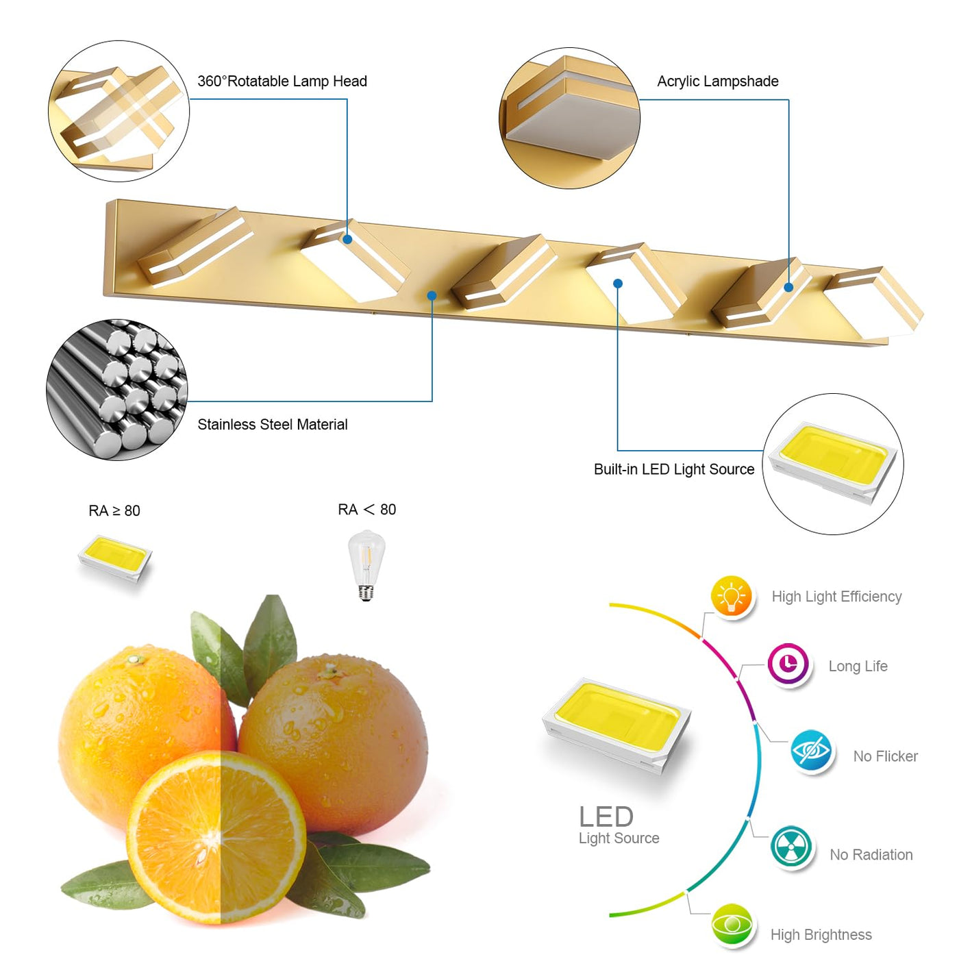 ?Material?Matte Gold Frame with advanced electroplate craft and sealing technology, dust-proof, fog-proof, anti-corrosion and moisture-proof, suitable for humid environment. Frosted White Solid Acrylic Lampshade is rugged, durable and unbreakable, provides excellent down lighting without glare. Gives a great contemporary look to your master bathroom. | ?Energy Saving?48W LED Cool White Vanity Light. Although only 48W, but gives off great lighting brightness more than ordinary 200W bulbs. Environmentally friendly and save more electricity. | ?Rotatable Lamp Design?360