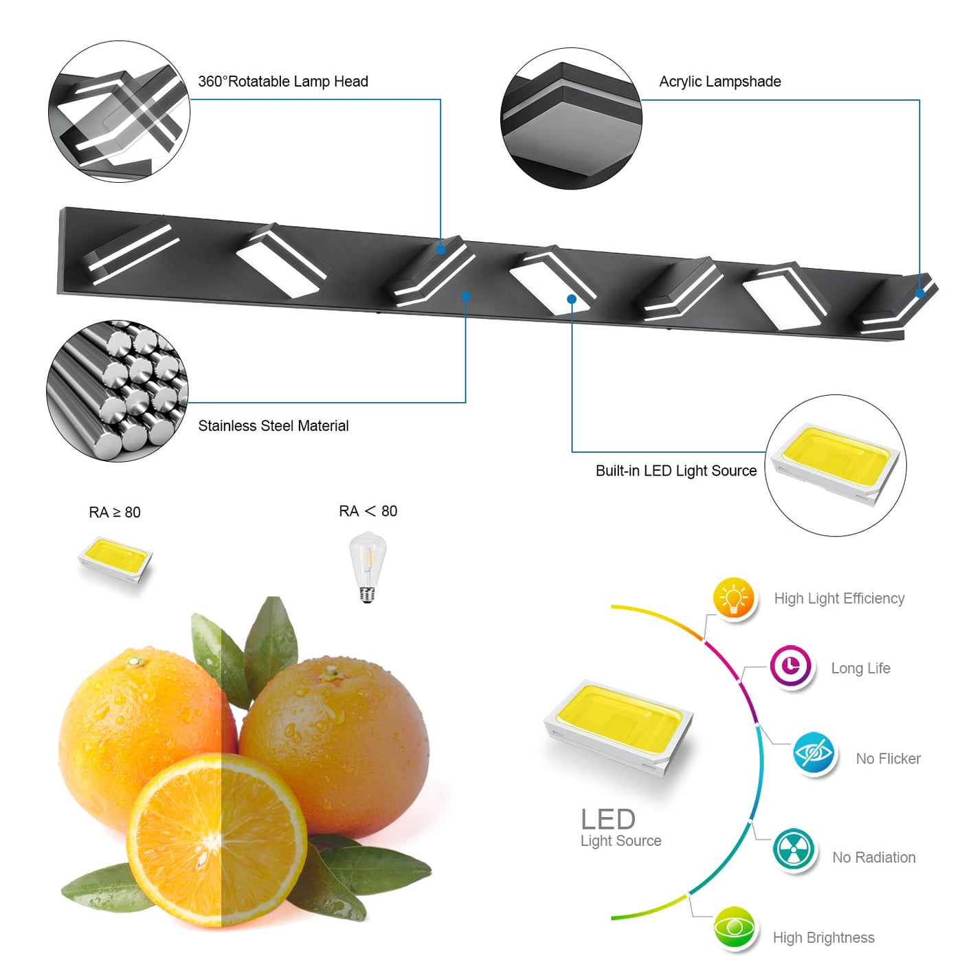?Material?Matte Black Frame with advanced electroplate craft and sealing technology, dust-proof, fog-proof, anti-corrosion and moisture-proof, suitable for humid environment. Frosted White Solid Acrylic Lampshade is rugged, durable and unbreakable, provides excellent down lighting without glare. Gives a great contemporary look to your master bathroom. | ?Energy Saving?56W LED Cool White Vanity Light. Although only 56W, but gives off great lighting brightness more than ordinary 240W bulbs. Environmentally friendly and save more electricity. | ?Rotatable Lamp Design?360? rotatable joint, can easily turn individual lights to different position if desired. The brightness is perfect for putting on makeup. | ?Easy to Install?This sleek and modern vanity light very easy to install. Sturdy fixture, gives off great lighting. Light is very bright with a cool color temperature and shoots it down. | ?Safety & Satisfaction?Quality approved power driver following ETL/UL standard, lamp fixtures parts following CE/ROHS/QCQ standard, IP44 waterproof and dust proof capacity. We believe in the quality of our product. We provide a 60-Day Refund and a 12-Month Replacement. If you have any problems, please contact us at any time, and we will reply within 24 hours and provide you with satisfactory solutions.
