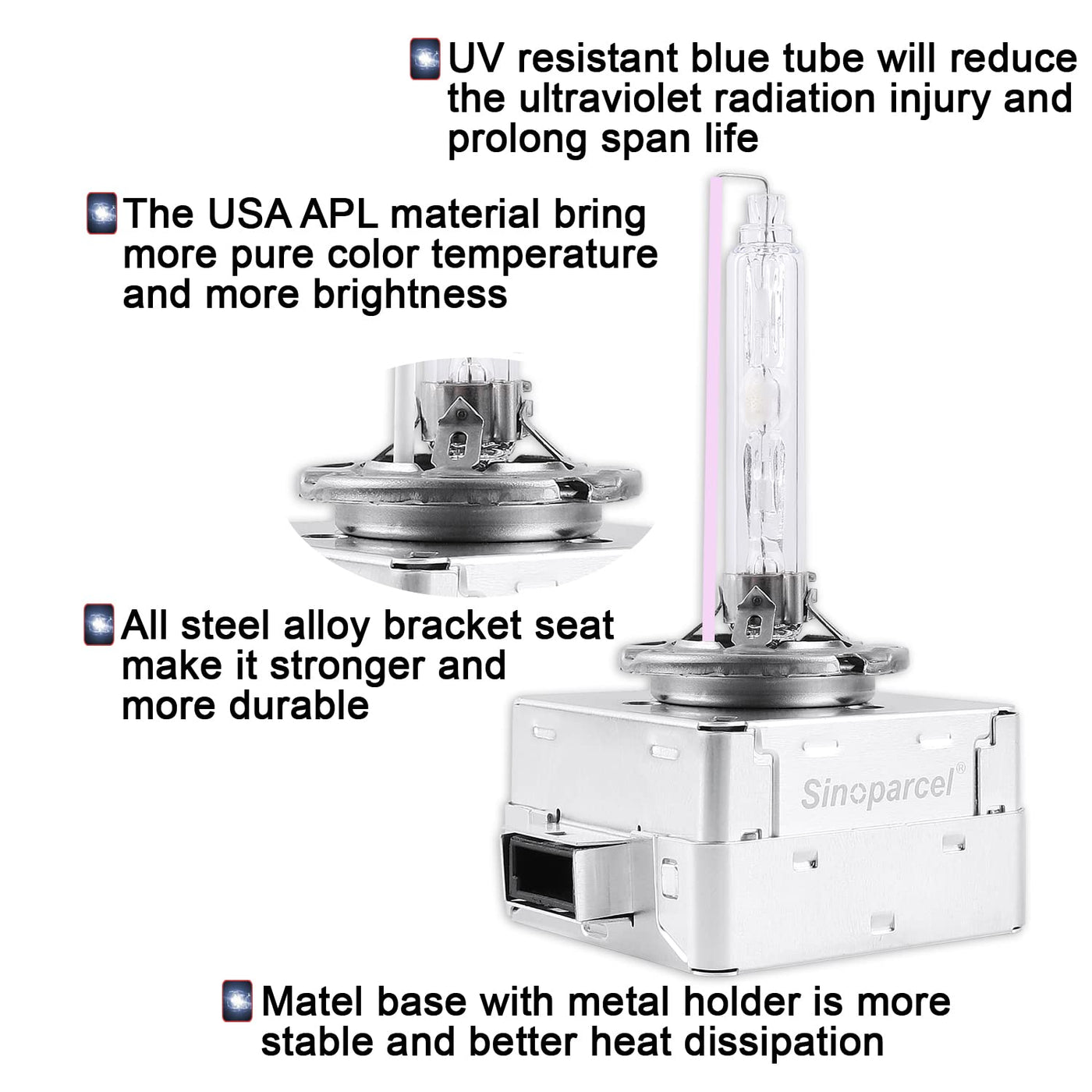 - Working temperature : -40 ~105 C- Bulbs Dimensions: 3.54 x 1.3 inch- Easy installation: Plug and Play, no tools needed Package includes:- 2x D3S Xenon HID Headlight Bulb - 6000K Here is the guide for Color Temperatures of HID bulbs: - 4300K = right white yellow tinge - 6000K = Bright white some detect slight blue - 8000K = White with blue tinge