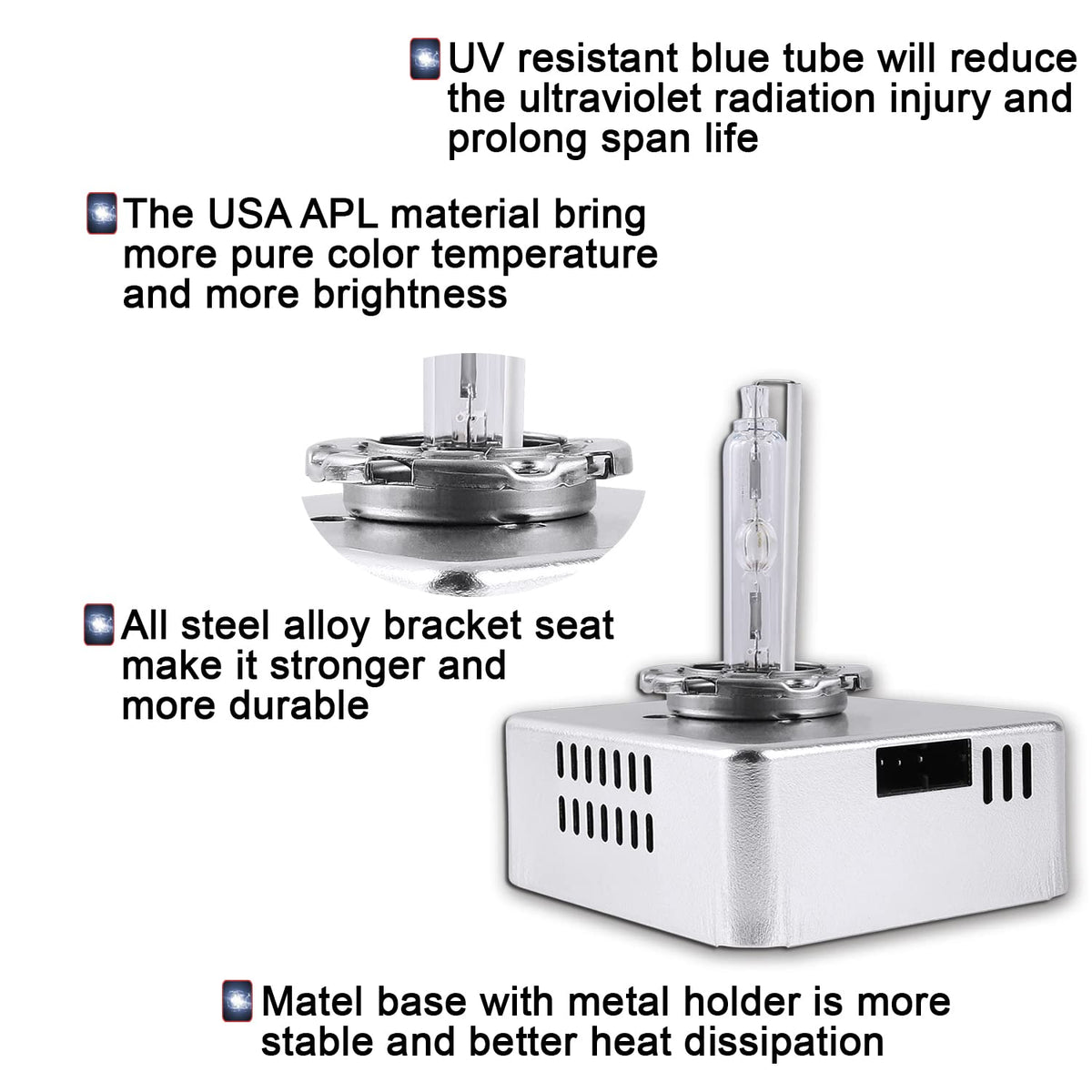 - Working temperature : -40 ~105 °C- Bulbs Dimensions: 3.54 x 1.3 inch- Easy installation: Plug and Play, no tools needed Package includes:- 1XD5S Xenon HID Headlight Bulb - 6000K Here is the guide for Color Temperatures of HID bulbs: - 4300K = right white yellow tinge - 6000K = Bright white some detect slight blue - 8000K = White with blue tinge What you get: -1x D5S Xenon HID headlight bulbs -1x User manual -Better night driving vision -Street Legal and level IP67 -HASSLE FREE support