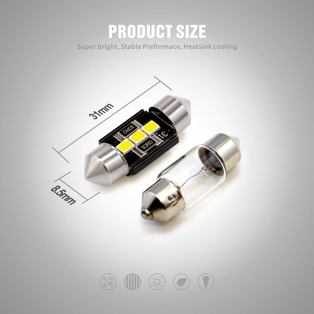 Value Pack of 6 bulbs, Super Bright LED Festoon Bulb, Fit bulb size: DE3175 31MM festoon, multiple usage automotive interior light bulb. Can fit applications like map light, dome light, door light, license plate light, trunk light depending on the model of the car. | non polarity specific which mean you can plug the bulb in either way and it will work just fine, they are non-canbus LED, if your car require Canbus, they will give you pop up error message. | Each bulb built with three 3030 high power SMD Chips. Give your car pure white super bright light output. | Direct replace the original halogen festoon bulb. Plug and play for easy installation. Please make sure they are right bulb size for your specific car | We offer 1 year warranty if the bulb confirmed to be manufacture defect or shipping damaged