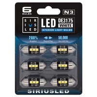 Q: What types of vehicles are compatible with the SIR IUS LED N3 DE3175 LED bulbs?A: The SIR IUS LED N3 DE3175 bulbs are compatible with various automotive interior applications such as map lights, dome lights, door lights, license plate lights, and trunk lights. However, compatibility may vary depending on the specific model of your vehicle.