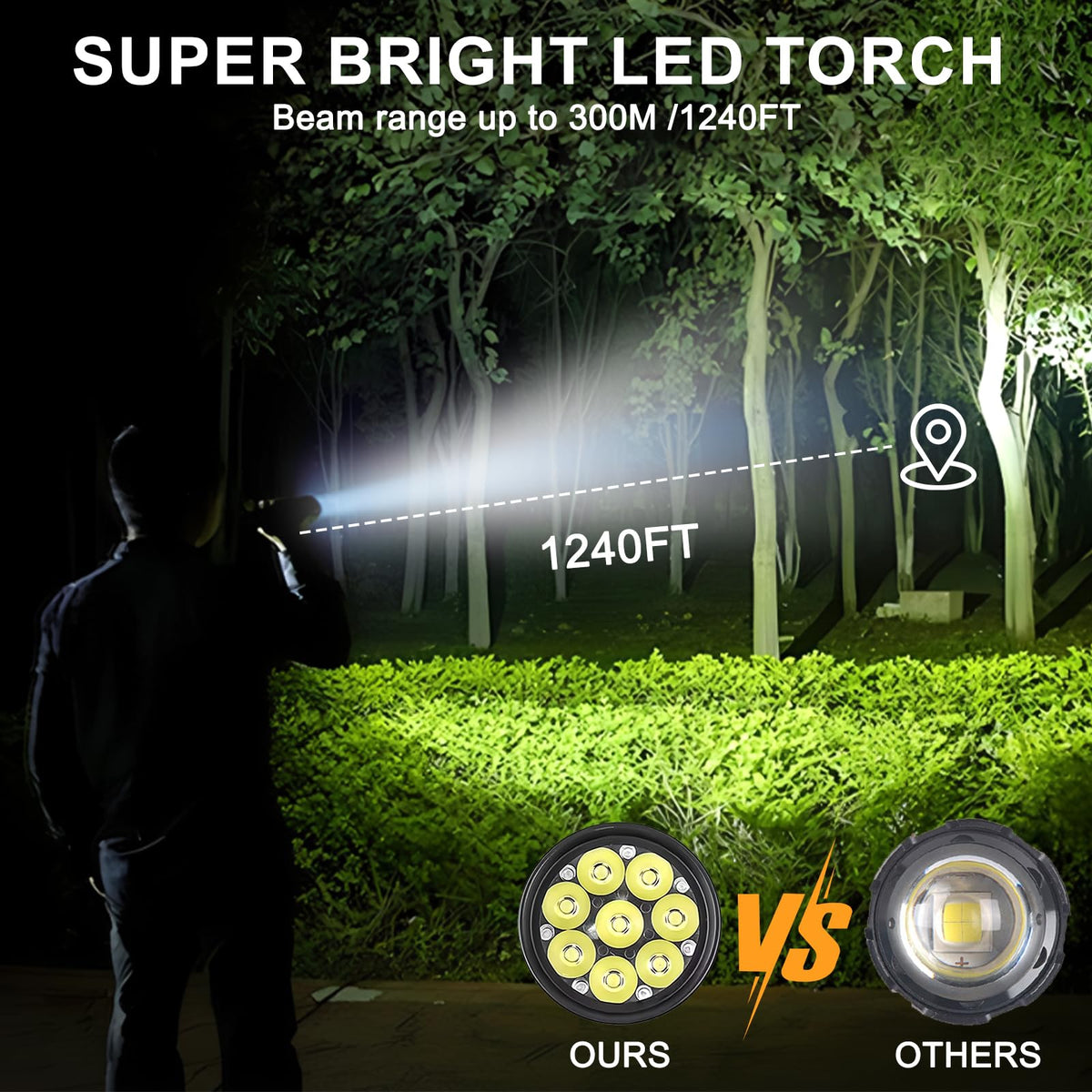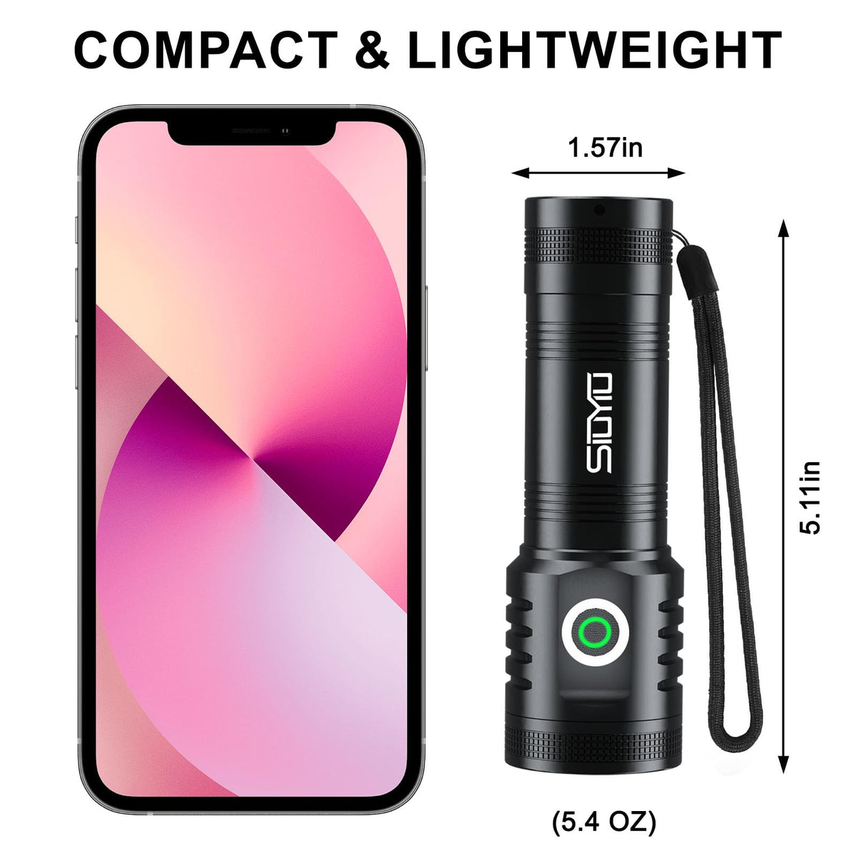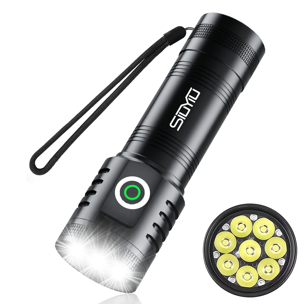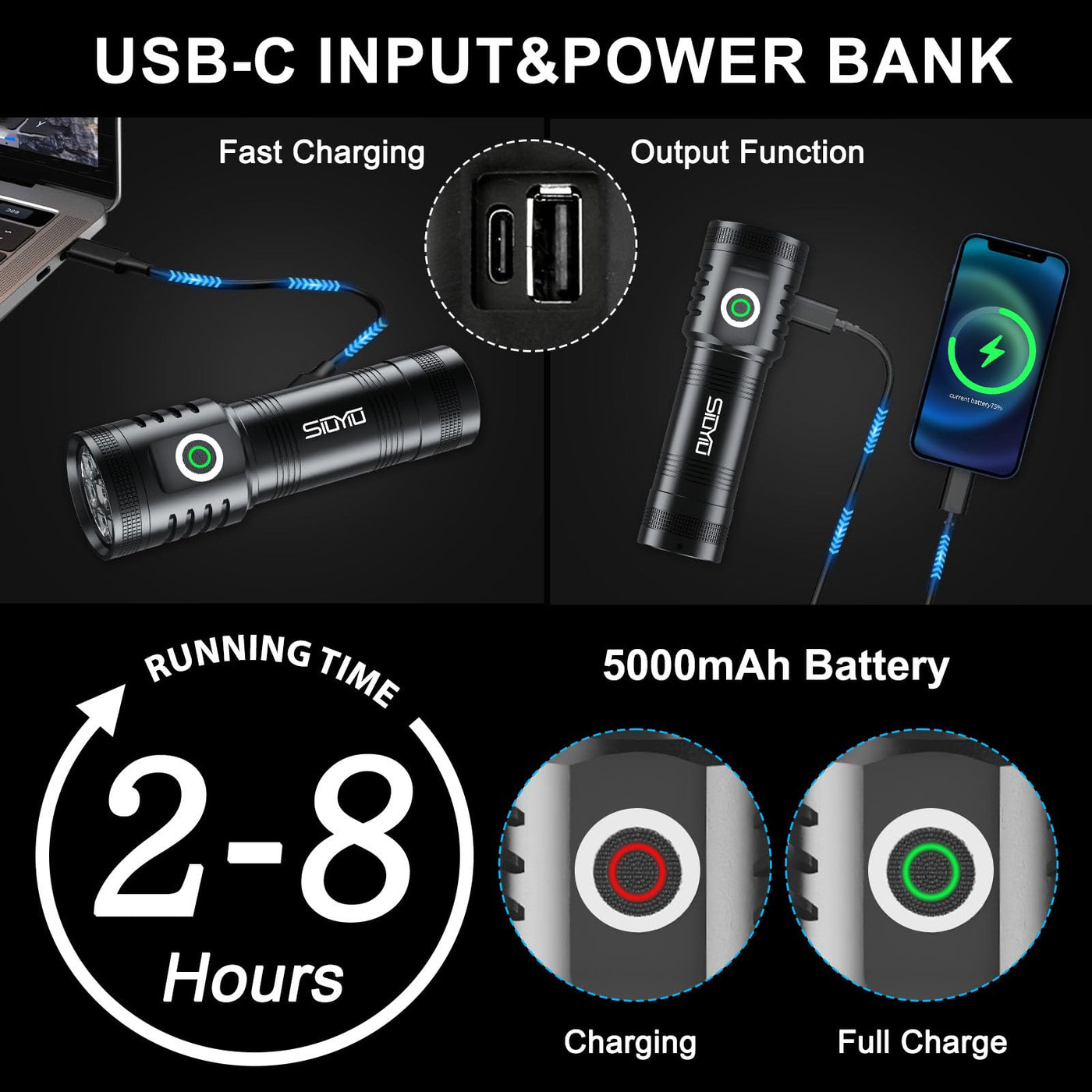 1 Super Bright LED Flahlight : Siuyiu flashlights high lumens provide 2600lm(Max ) and can be up to 1000 feet illumination distance , Best choice as a camping flashlight or flash lights for emergency. 2.USB Rechargeable Flashlight : Rechargeable 2-in-1Flashlight with USB cable, Rechargeable Flashlight could Conveniently charged by any USB interface, and an output function that allows you to charge your phone. 3.Convenience : LED flashlight light weight and compact size for portability. A pocket-friendly compact chassis with a Hanging rope makes this rechargeable pocket flashlight convenient to carry in everyday life. Model: 1250 Bead: 8* XPG Brightness: 2600 Lumen Battery: 5000 mAh 5 Mode: High-Medium-Low-Flash-SOS. Operating Time: 2-8h (depending on the mode of use) Charging Time: Approx. 4 -5hours Waterproof Rating: IPX4, but cant be soak in water Dimension (L*W*H): 5.11*1.57*1.57IN Case Material: Aluminium alloy Colour: Black Weight: 5.5 OZ Accessories list: 1*5000mAh Rechargeable Battery Flashlight + 1* Type-C Cable + 1* User Manual+1 * Bo