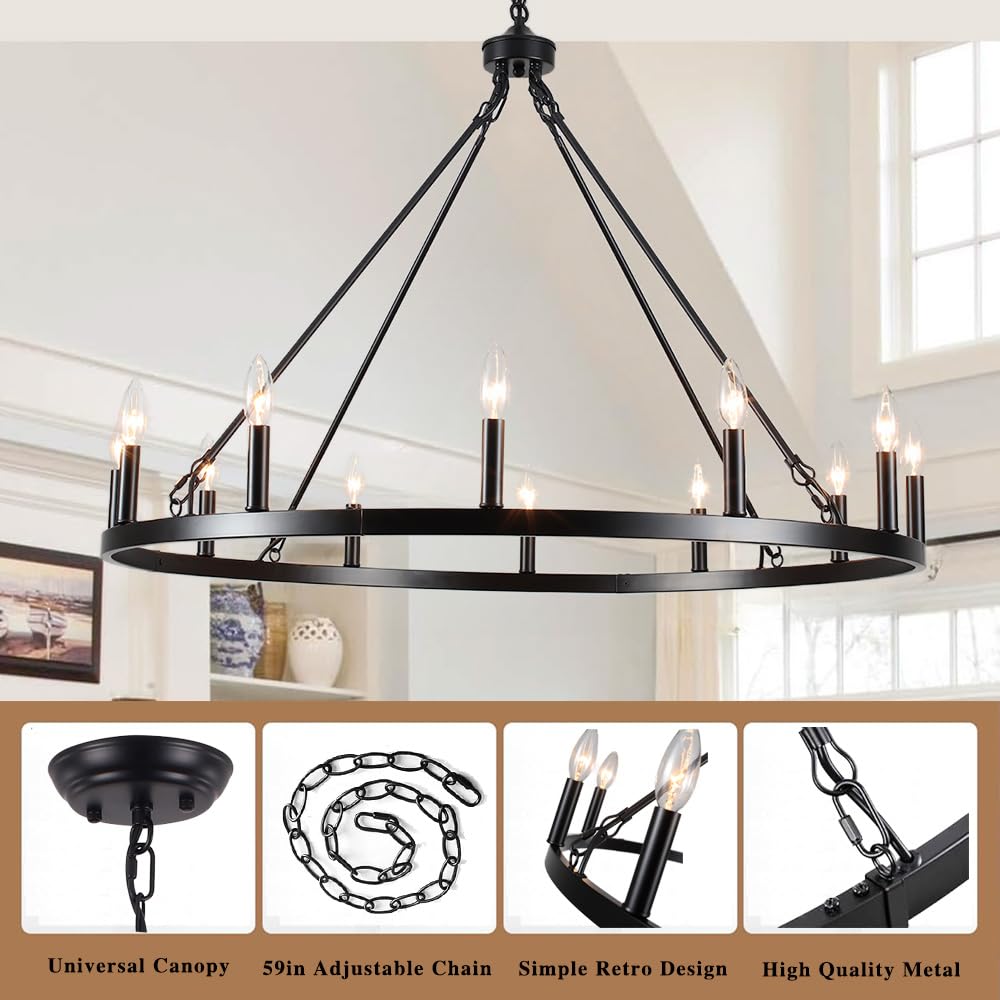 Sjccdsgs Black Large Wagon Wheel Chandelier 38 Inch, 12 Lights Farmhouse Chandelier, Industrial Rustic Candle Pendant Light Fixt