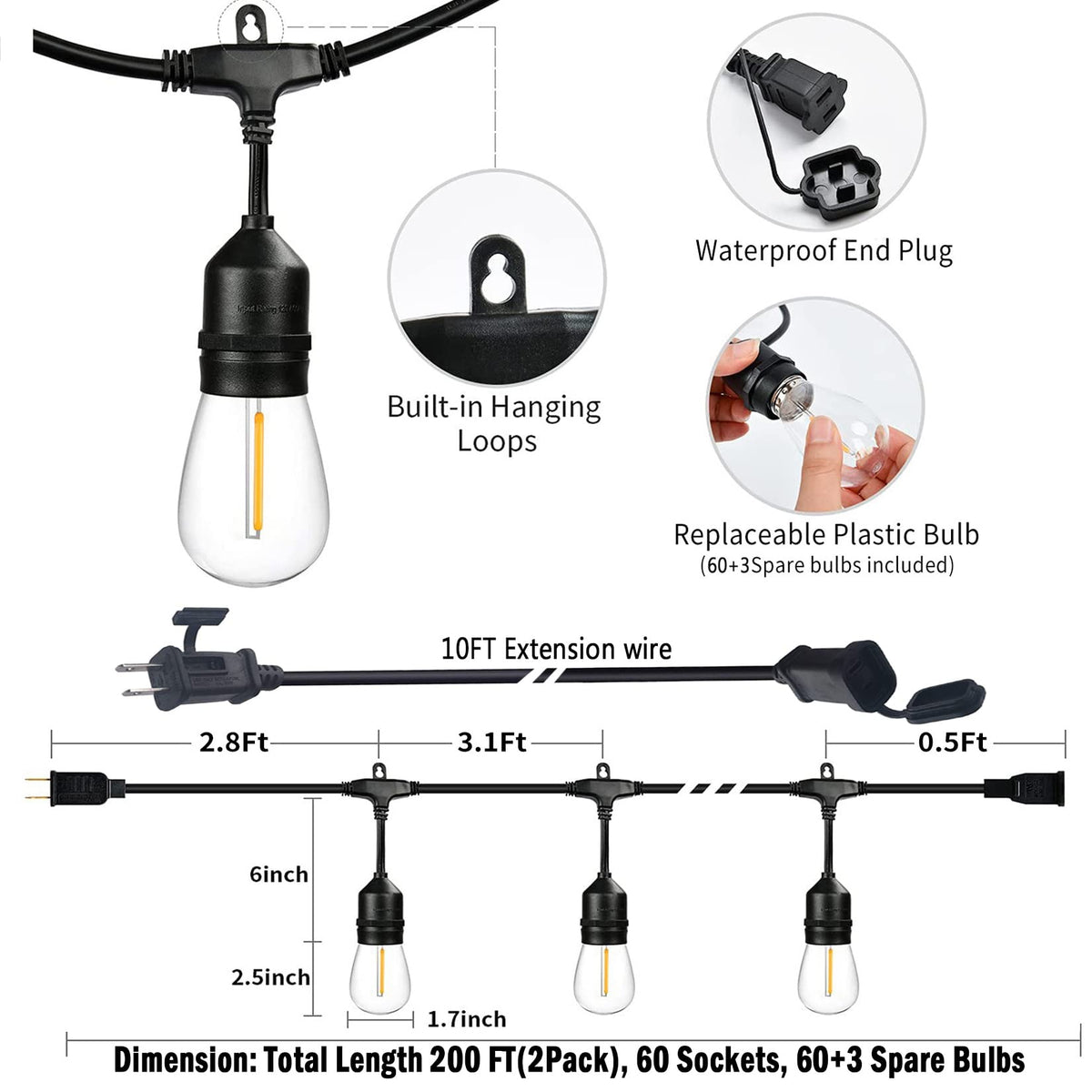 200FT Outdoor String Lights for Outside Patio Lights Outdoor Waterproof with 63 Shatteproof bistro Lights Outdoor String Lights 2200K Outdoor Lights for Patio Gazebo Pergola Café