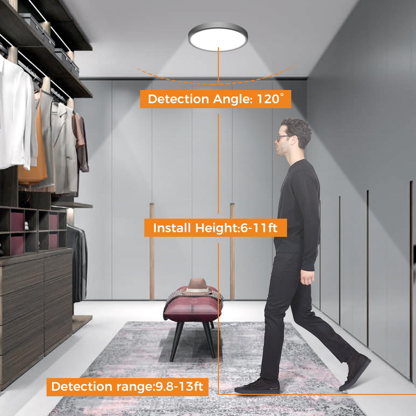 Q: What is the detection range and angle of the slochi Motion Sensor Ceiling Light?A: The slochi Motion Sensor Ceiling Light features a detection angle of up to 120° and a detection range of 9.8 to 13 feet. This ensures efficient motion activation performance for various indoor spaces.