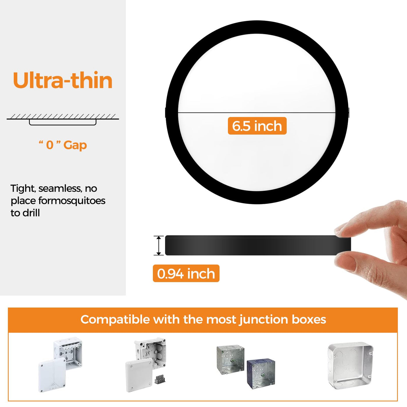 Q: What are the dimensions of the Slochi LED Flush Mount Ceiling Light?A: The Slochi LED Flush Mount Ceiling Light has a diameter of six point five inches and a thickness of approximately zero point nine four inches.