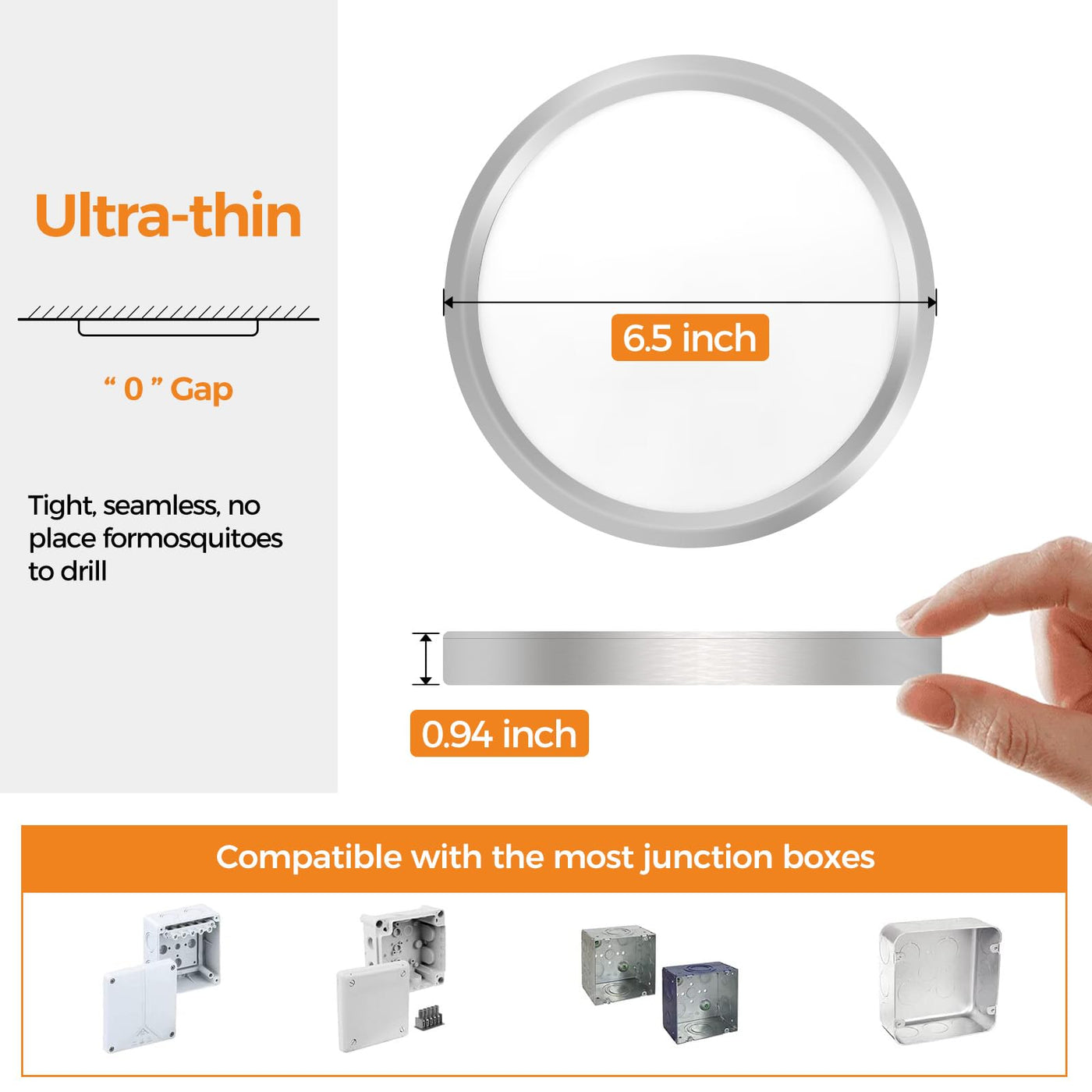 Q: What are the dimensions of the LED flush mount ceiling light?A: The dimensions of the LED flush mount ceiling light are six and a half inches in diameter and approximately nine hundred forty thousandths of an inch in thickness.