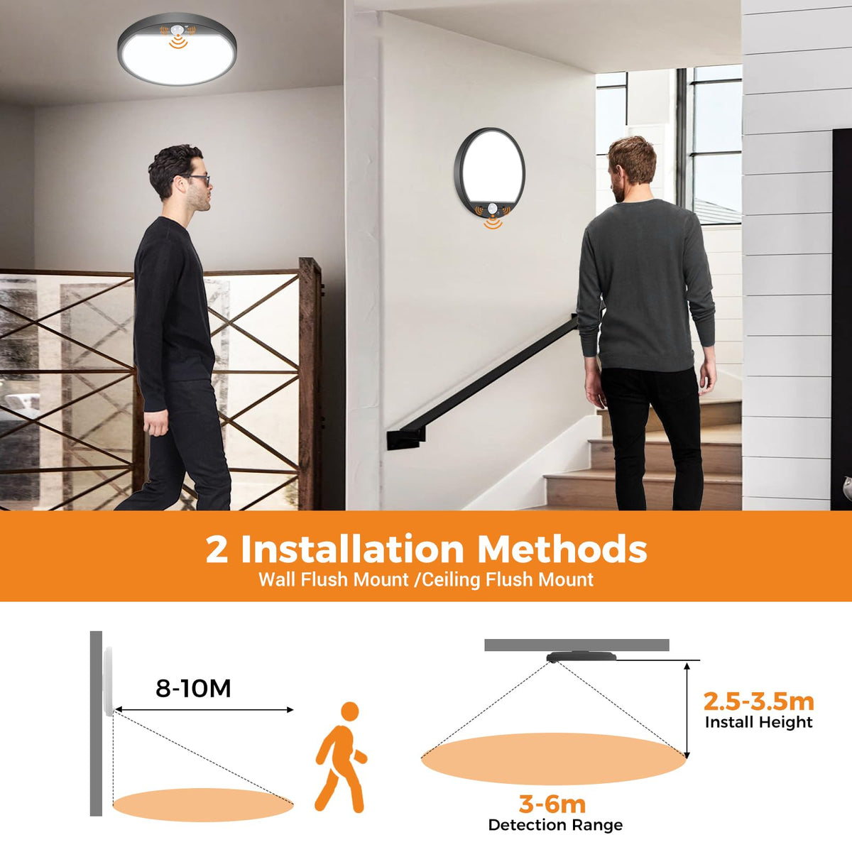 This ceiling light features a sleek black design and is constructed from well-made plastic, ensuring durability and a modern aesthetic. With its built-in PIR motion sensor, it offers a detection angle of 120° and a range of 3 to 6 meters, making it suitable for various mounting heights between 2.5 to 3.5 meters. The light is hardwired for easy installation, allowing for a hassle-free setup without the need for an electrician.