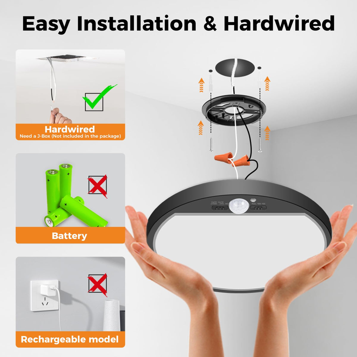 The Slochi Motion Sensor Ceiling Light features a sleek black design that blends seamlessly with any decor. Made from well-made plastic, this durable fixture is hardwired for easy installation and provides reliable lighting with energy-saving benefits. The built-in PIR motion sensor operates within a 120° detection angle and detects motion up to 6 meters away, ensuring that your space is well-lit whenever you need it.