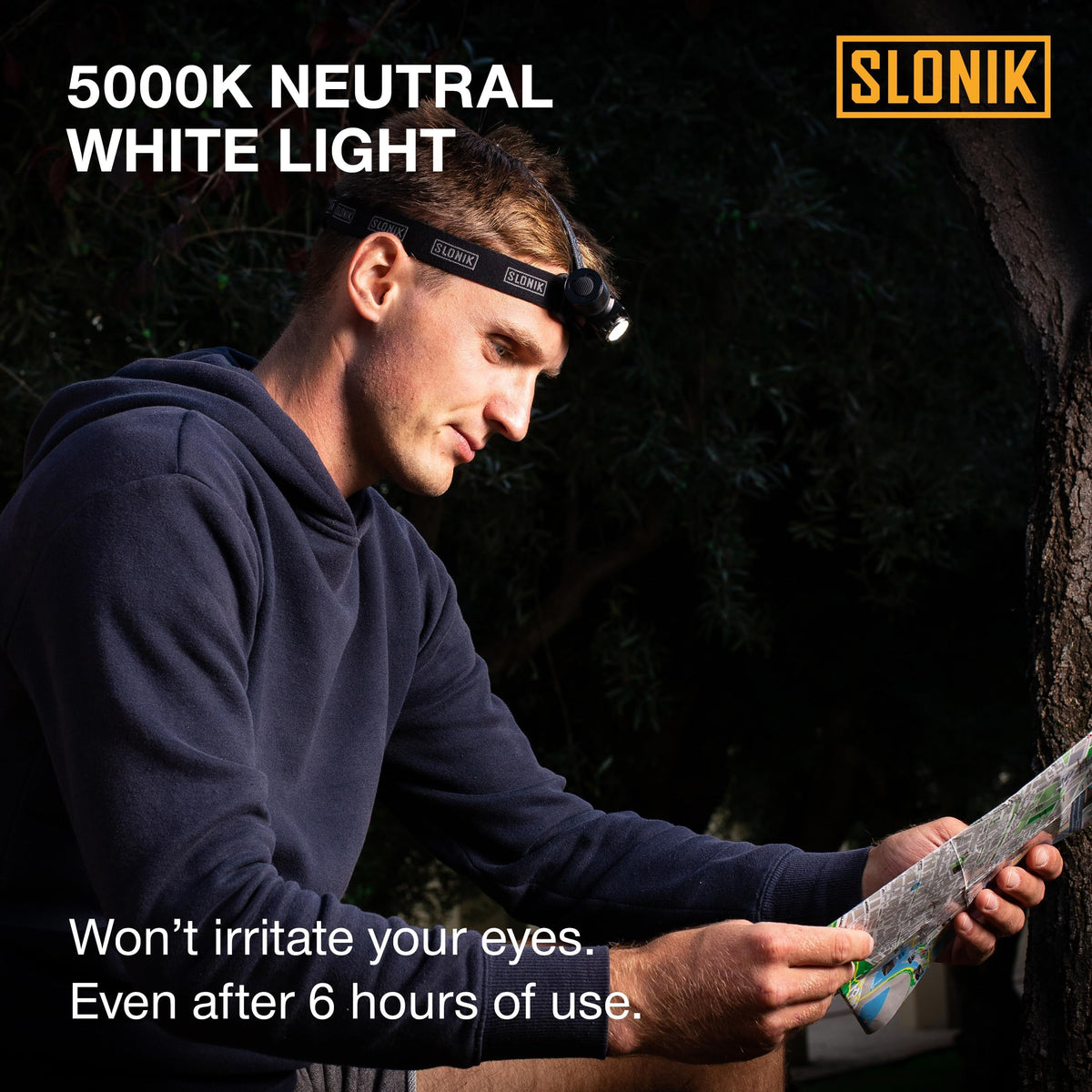 Q: What is the brightness of the SLONIK headlamp?A: The SLONIK headlamp features a powerful output of 1000 lumens, providing an impressive 60-foot beam that illuminates your path effectively for outdoor activities.