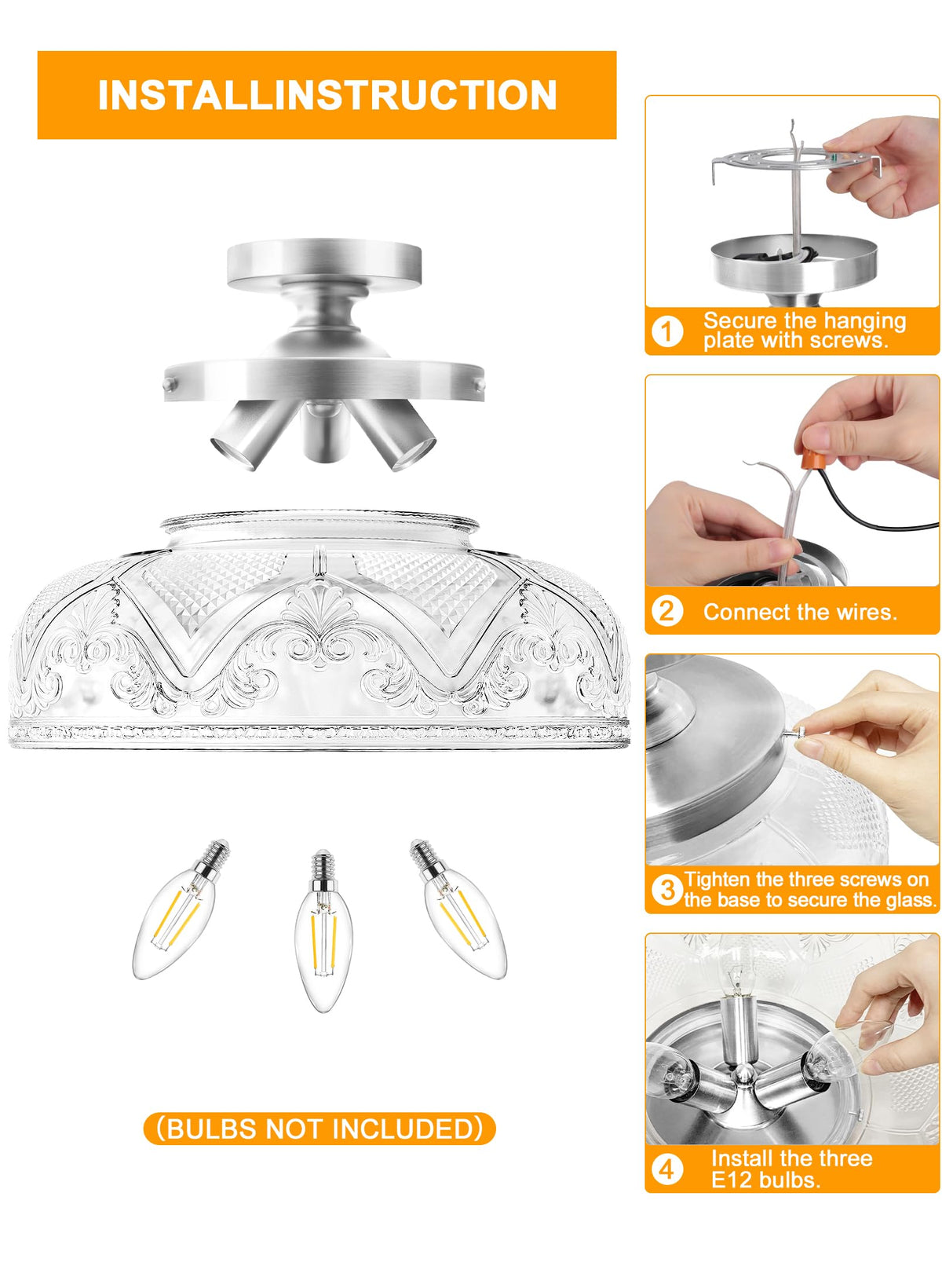 Slypadan Semi Flush Mount Ceiling Light, 12 Inch Large Silver Ceiling Light Fixture, 3-Light Globe Glass Farmhouse Kitchen Light