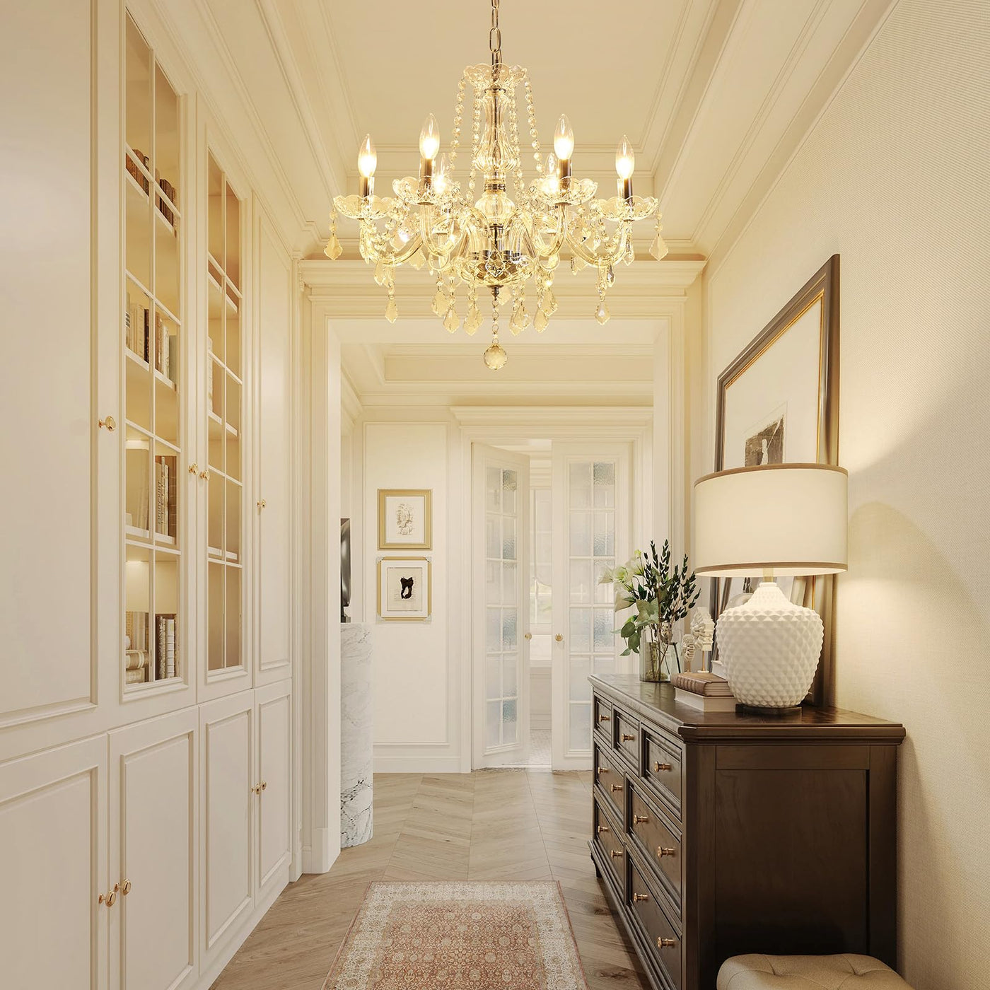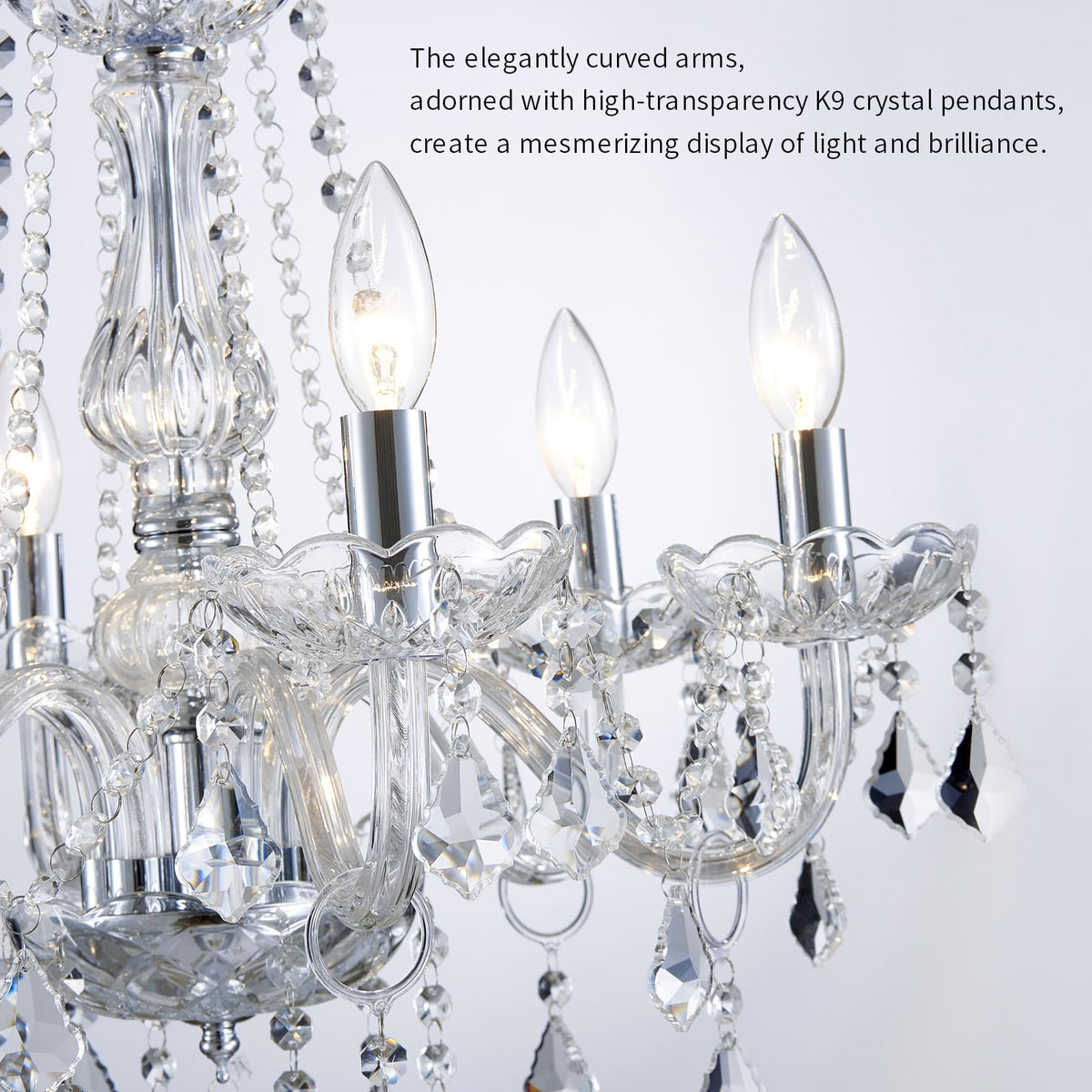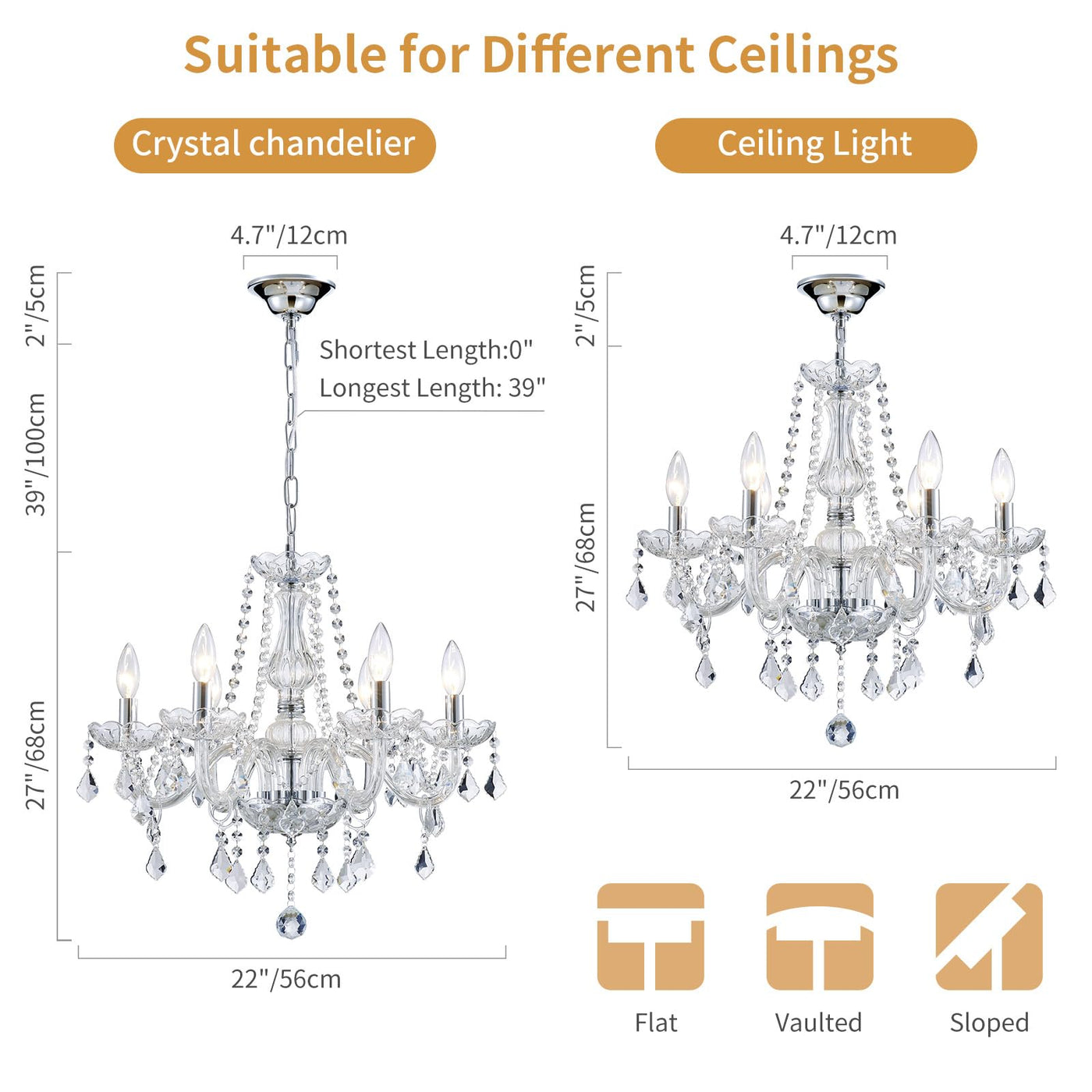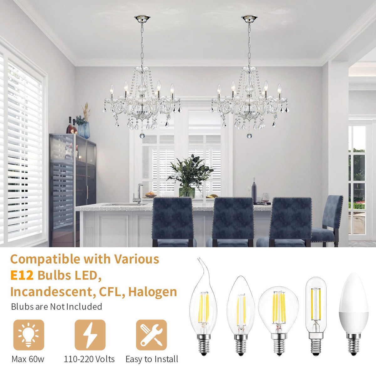 Elegant Modern Chandelier: Our mini crystal chandelier designs marry sophistication with practicality, crafted to illuminate your spaces with warmth and style. Its luxurious glass frame and sophisticated ambiance perfectly complement minimalist decors, adding a touch of glamour, warmth, and elegance to any space. Lighting Perfection: This chandelier adorned with sparkling crystals, can be used both as a pendant light and a ceiling light, from living rooms and dining areas to bedrooms and entryways, offering versatility in design. Adds an air of sophistication and elegance to any space. High-Quality Materials: This crystal hanging light fixture uses high grade K9 crystals, featuring elegantly curved glass arms, also boasts excellent texture and gloss, makes the whole ceiling light more stunning and sparkling from different angle, no matters when you turn on the light or turn off the light. 6 Lights Crystal Candle Chandelier: Rustic light fixtures compatible with any E12 base bulb (Incandescent,CFL,halogen,LED bulbs suitable, Max 60W for each bulb,Not included). Using different color temperatures of the bulb, the pendant light will show a different atmosphere. Easy Installation: This crystal ceiling hanging chandelier has been carefully designed installing is a breeze. Simply follow the included instructions and use the adjustable chain to hang it at the desired height. Whether you're a seasoned DIYer or a first-time installer, you'll have this samll chandelier light fixture up and shining in no time.