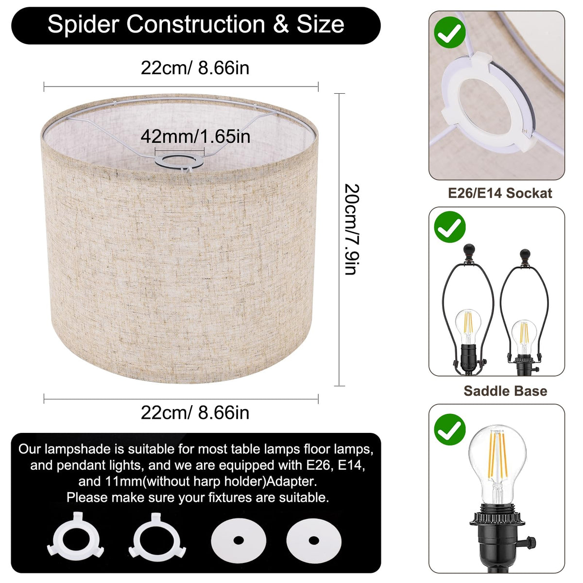 Elevate your home decor with these white lamp shades, crafted from natural linen for a timeless and elegant look. These small drum lampshades measure 8.7'' at the top, 8.7'' at the bottom, and 7.9'' in height, making them a versatile choice for table lamps, floor lamps, or chandeliers. Designed with a spider fitter, these shades require assembly but offer a custom fit for your lighting fixtures. Handcrafted with attention to detail, these lampshades will add a touch of sophistication to any room. Whether you're creating a cozy reading nook or illuminating your living space, these lamp shades will complement your style beautifully.