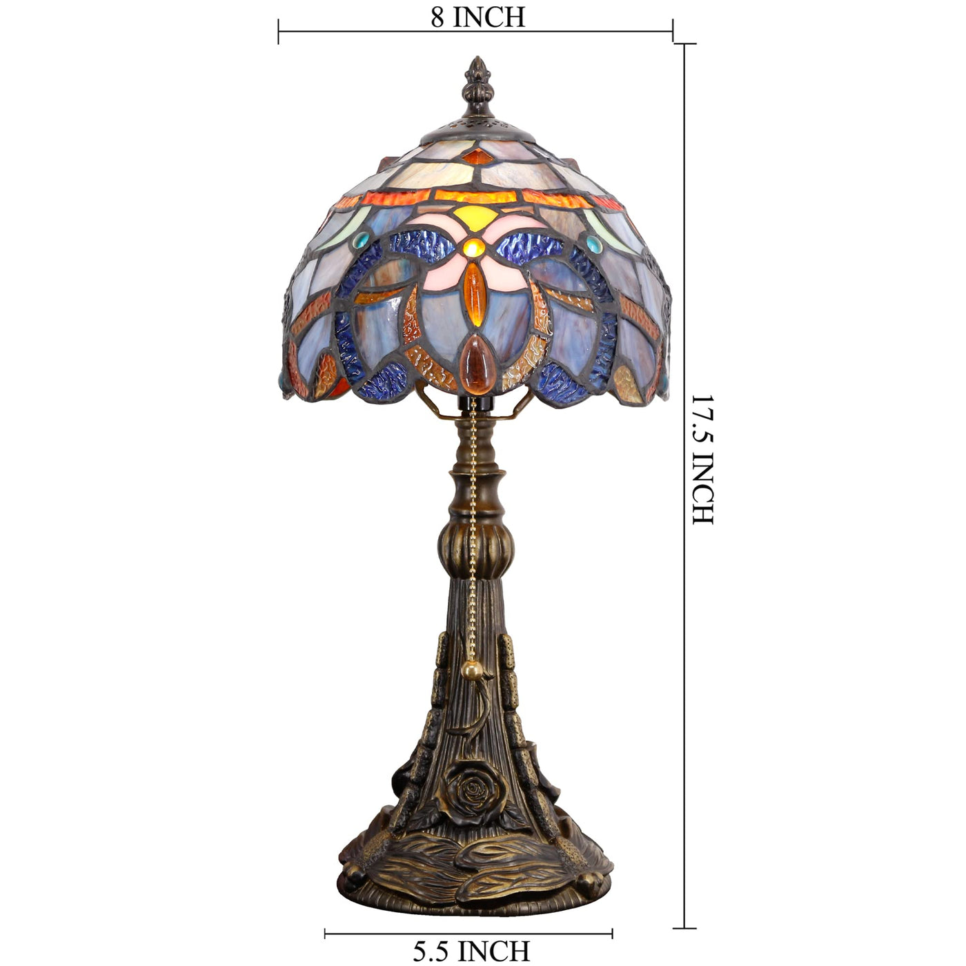Q: What are the dimensions of the Small Tiffany Lamp?A: The lamp measures 8 inches in width and depth, and stands 17.5 inches tall. The shade size is 8 inches wide by 5.9 inches high.