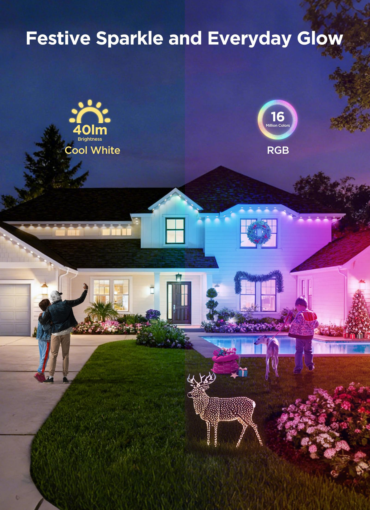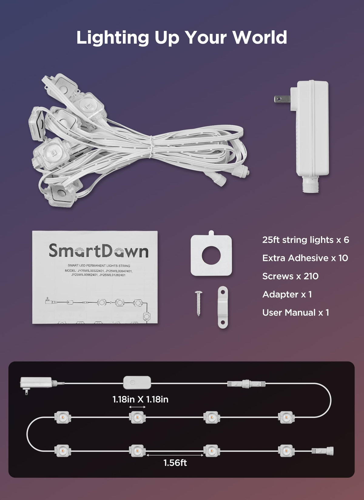 Smartdawn Permanent Outdoor Lights - Light Up Lifes Moments! Ultimate Customizable Holiday Magic! 150Ft Permanent Outdoor Rgb Led Lights Professional-Grade Lighting System With 96 High-Brightness Leds (6?25Ft Strands). Features: 50+ Modes &Amp; 16M Colors For Holidays/Events App Control (Individual Bulb Adjustment) Built For Extreme Weather Engineered To Last: Ip68-Rated Led Strands (Dustproof/Waterproof No Fogging) Ip67-Rated Controller (Weather/Uv-Resistant) Acrylic Lens (Anti-Yellowing 50 000-Hour Lifespan) Withstands -4F To 140F (-20C To 60C)-Ideal For Year-Round Use! Cuttable &Amp; Expandable Design: Diy-Friendly! Cut Or Connect Strands To Fit Any Space: 24V/24W Adapter: Max 100Ft (4X 25Ft Strands) 24V/48W Adapter: Max 150Ft (6X 25Ft Strands) 24V/72W Adapter: Max 300Ft (12X 25Ft Strands) (Exceeding Limits May Reduce Brightness.) Vhb Tape + Screw Mounts For Easy Installation Perfect For: Houses Holidays (Christmas/Halloween) Landscapes And Events. Includes: Light Strands Adapters &Amp; Mounting Kit.