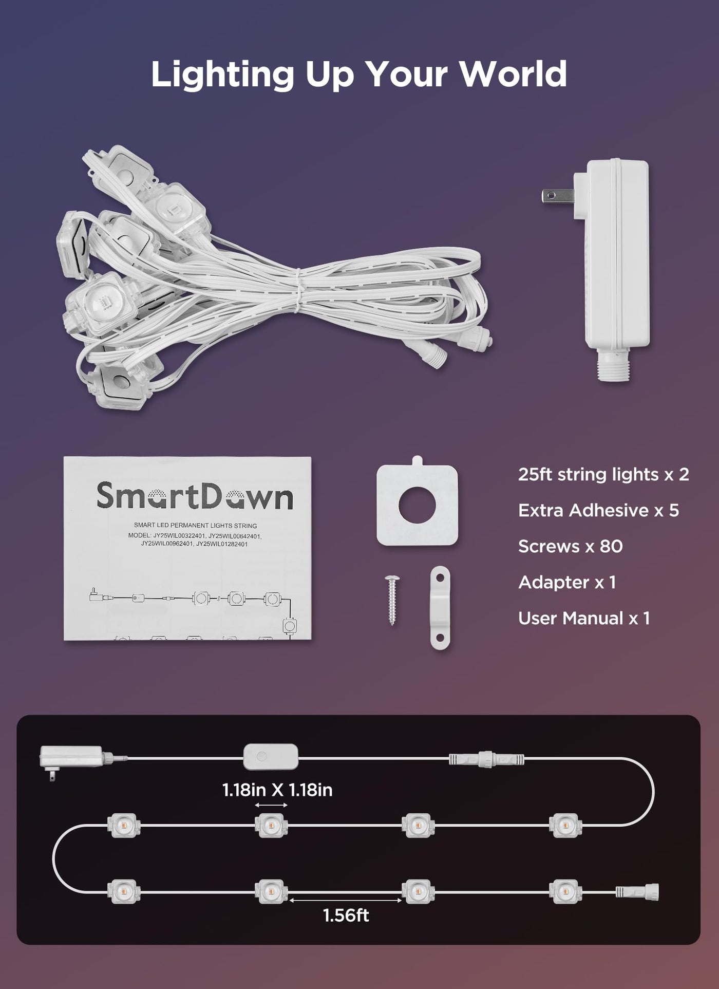 Smartdawn Permanent Outdoor Lights - Light Up Lifes Moments! Ultimate Customizable Holiday Magic! 50Ft Permanent Outdoor Rgb Led Lights Professional-Grade Lighting System With 32 High-Brightness Leds (2?25Ft Strands).&Nbsp; Features: 50+ Modes &Amp; 16M Colors For Holidays/Events App Control (Individual Bulb Adjustment) Built For Extreme Weather Engineered To Last: Ip68-Rated Led Strands (Dustproof/Waterproof No Fogging)&Nbsp; Ip67-Rated Controller (Weather/Uv-Resistant) Acrylic Lens (Anti-Yellowing 50 000-Hour Lifespan) Withstands -4F To 140F (-20C To 60C)-Ideal For Year-Round Use! Cuttable &Amp; Expandable Design: Diy-Friendly! Cut Or Connect Strands To Fit Any Space: 24V/24W Adapter: Max 100Ft (4X 25Ft Strands) 24V/48W Adapter: Max 150Ft (6X 25Ft Strands) 24V/72W Adapter: Max 300Ft (12X 25Ft Strands) (Exceeding Limits May Reduce Brightness.) Vhb Tape + Screw Mounts For Easy Installation Perfect For: Houses Holidays (Christmas/Halloween) Landscapes And Events.&Nbsp; Includes: Light Strands Adapters &Amp; Mounting Kit.