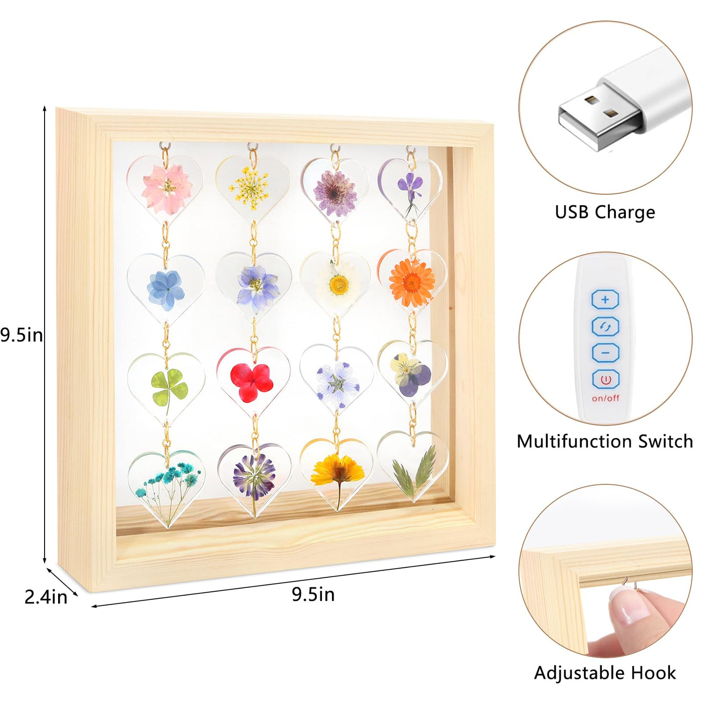Q: What materials are used in the construction of this lamp?A: The lamp is crafted from a durable pine wood frame and features hanging disks made from natural dried flowers encased in crystal resin, ensuring both aesthetics and longevity.