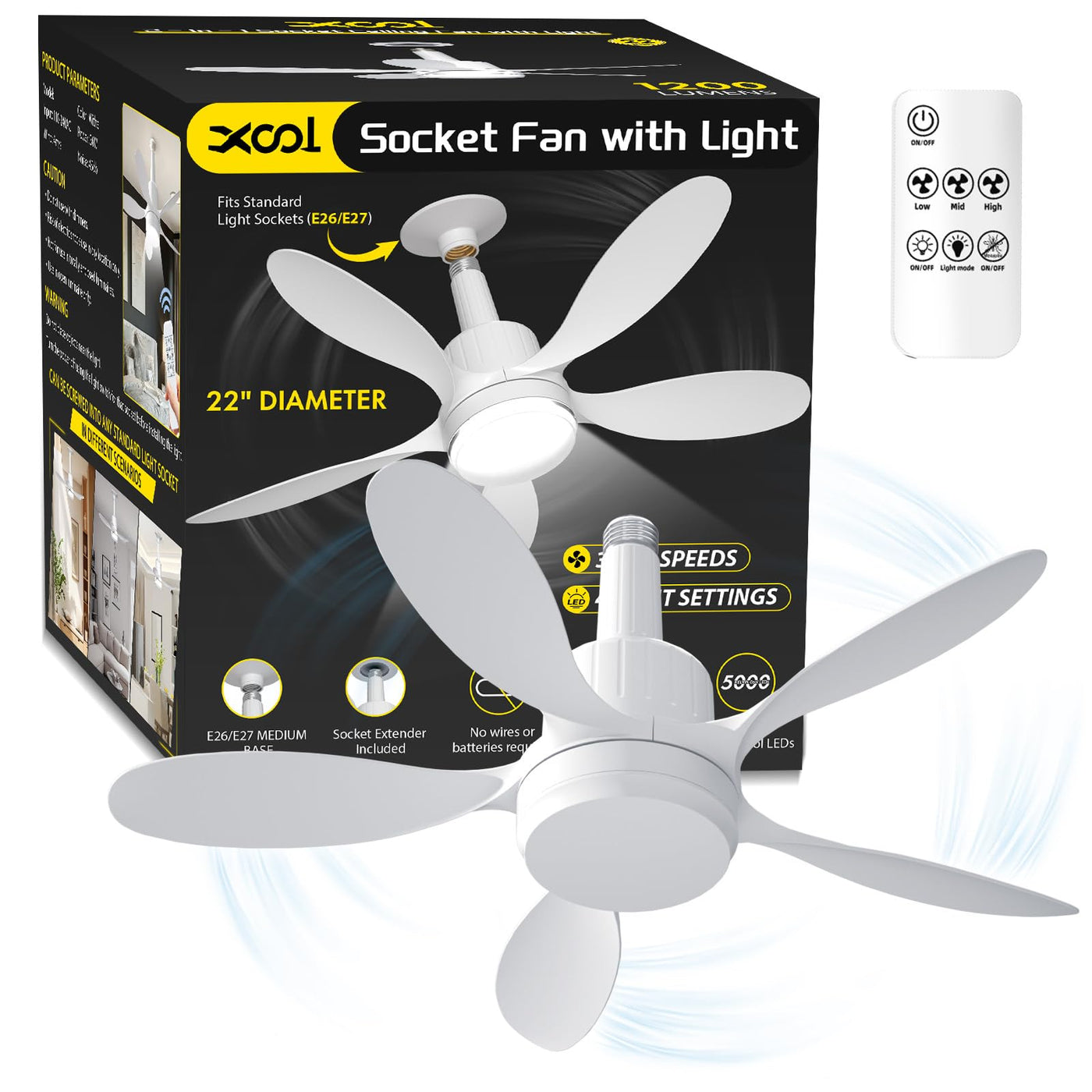 Enhance your living space with this versatile XOOL Socket Fan Light 22" ceiling fan that seamlessly combines airflow and illumination. Designed for living rooms, bedrooms, kitchens, and bathrooms, this fan features a dimmable LED light with three color options and an impressive 1200 lumens output. The screw-in socket allows for easy bulb replacement, while the included remote control offers convenient operation. With its sleek design and functionality, this ceiling fan keeps you cool and provides ambient lighting, creating a comfortable and inviting atmosphere. Measuring 22 inches (approximately 56 cm) in diameter, it's the perfect size for most spaces. Upgrade your home with this multi-purpose Socket Fan Light and enjoy the ideal blend of comfort and style.