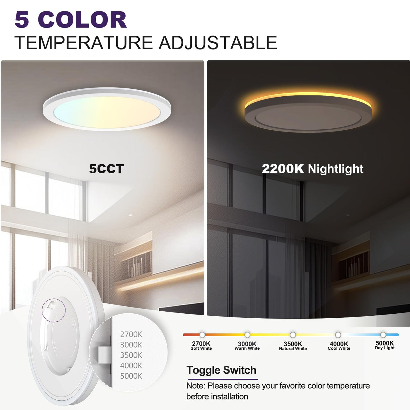 Q: What are the different color temperature options available for the Sofiton LED Flush Mount Ceiling Light?A: The Sofiton LED Flush Mount Ceiling Light offers five selectable color temperature options: 2700K, 3000K, 3500K, 4000K, and 5000K, allowing you to customize the ambiance of your space.
