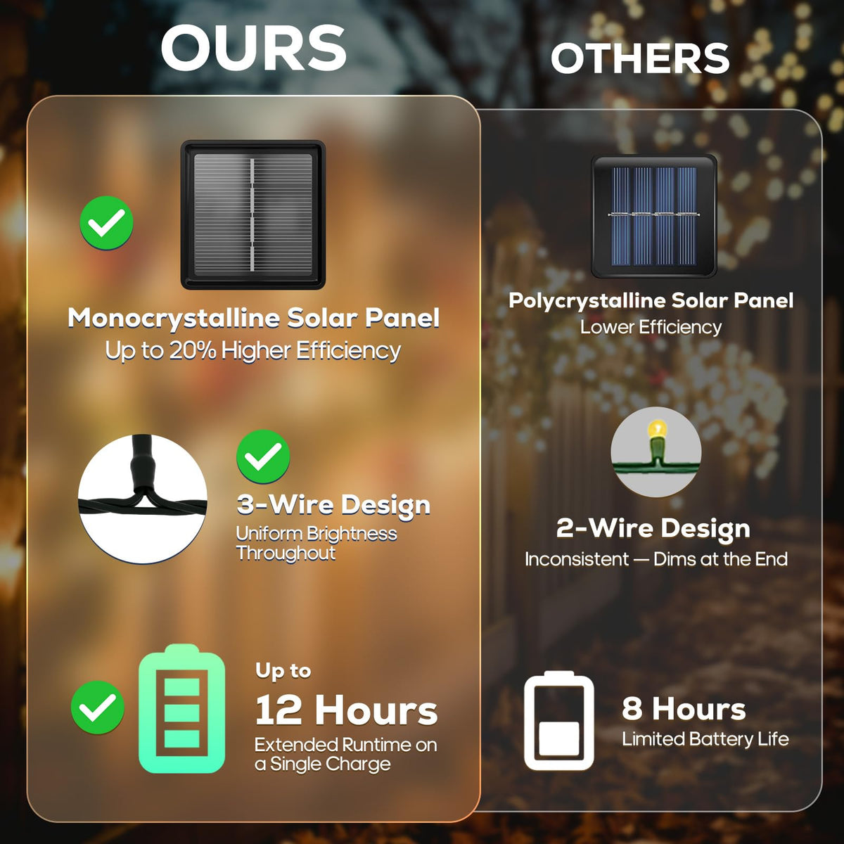Product Name: 2-Pack Outdoor Solar Light String Environmental Protection Main Features: Length: 1Pack Length 39Ft + 7Ft Lead Length, Total Length 92Ft. 92 Feet Of Illumination When Both Strands Are Used Together (46 Ft X Two Strands) Led Quantity:?120 Leds Per Strand?(Total ?2400 Leds?For Set) Solar Panel:?Single Crystal Silicon??6V /800Ma? 8 Lighting Modes Ip65 Waterproof Grade Charging Time: 4-6H, Upgraded Monocrystalline Solar Panel Charges Fully In Just ?4~6 Hours?Of Direct Sunlight Battery Life: 8-12H, Enough To Light Up The Whole Night. Switch Mode: The Light Source Will Automatically Turn Off In The Morning And Turn On In The Evening. It Should Be Noted That The Switch Induction Will Be Affected By The Surrounding Light Source. Be Careful To Avoid Interference From Other Light Sources, Which Will Cause The Light To Go Out. This Is Normal. Notes: Actual Runtime Varies By Sunlight Exposure And Weather Conditions* Light Sensor Sensitivity May Vary By Installation Environment* Recommended For Outdoor Use Only (Not Suitable For Pools/Spas)