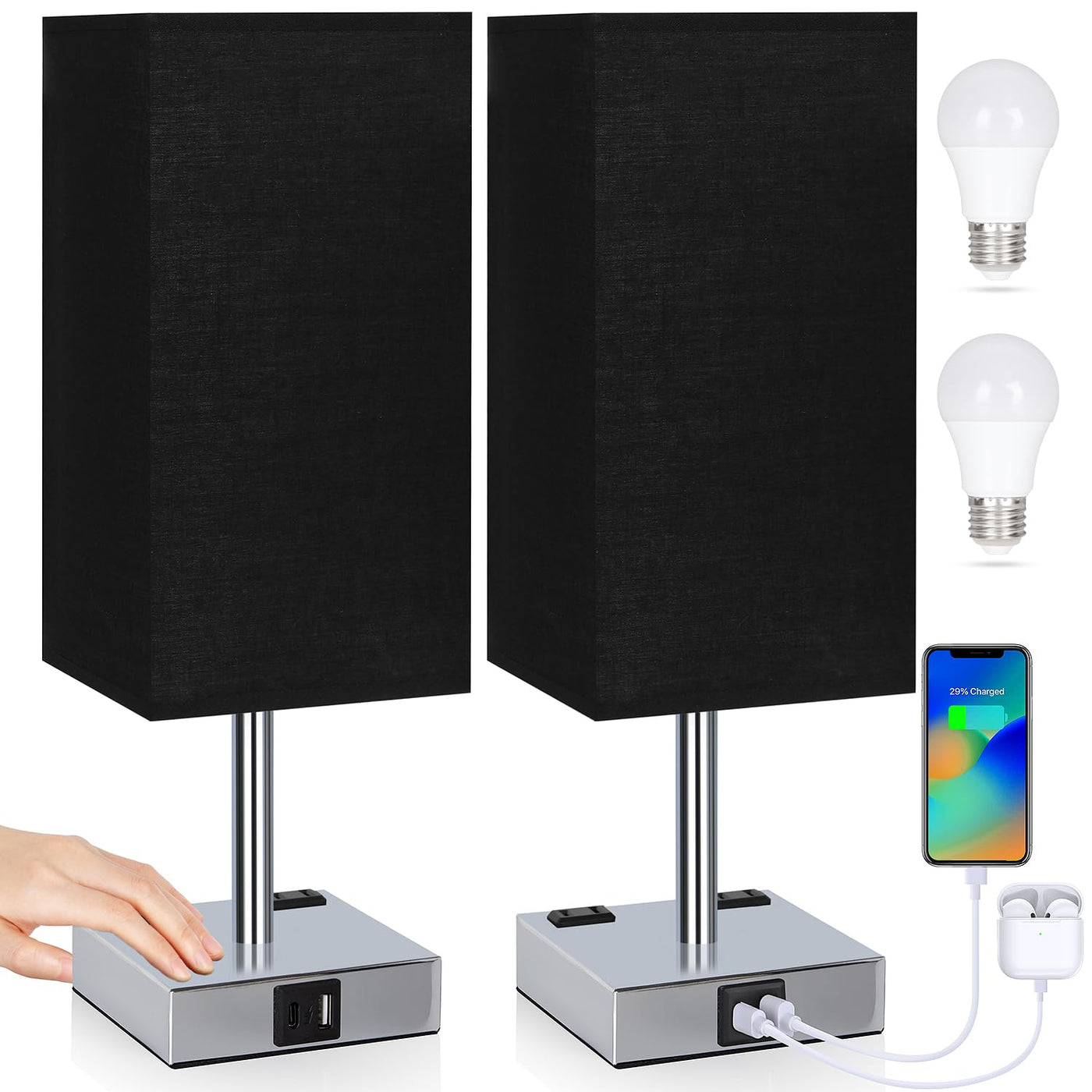 Soilsiu 3-Way Dimmable Bedside Table Lamp Set With Usb Ports & Ac Outlets - Black