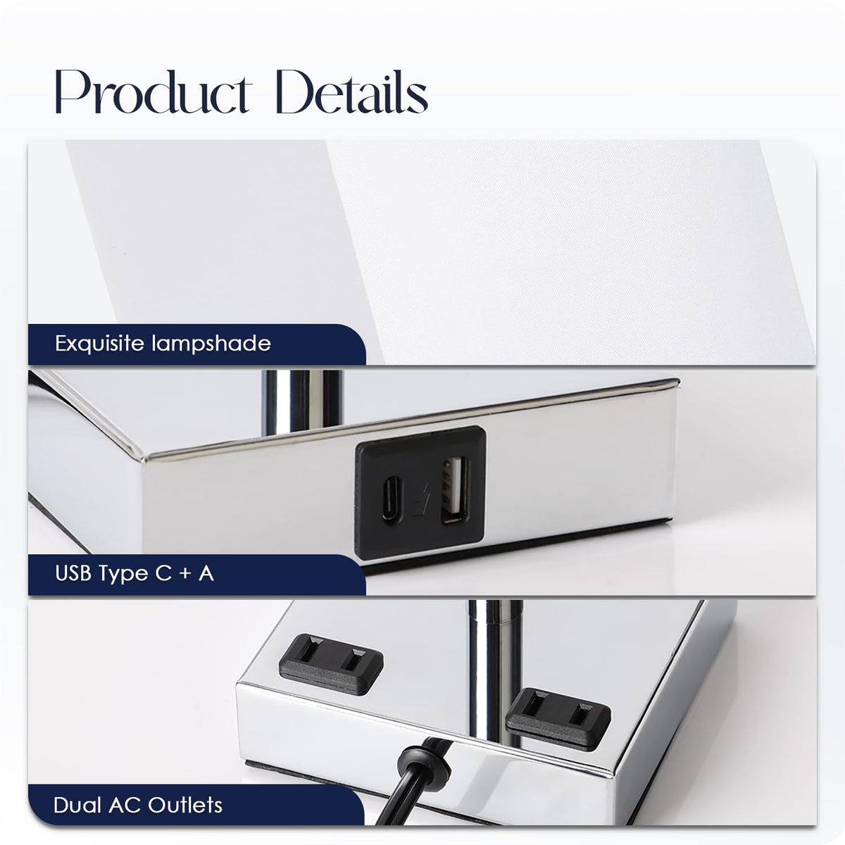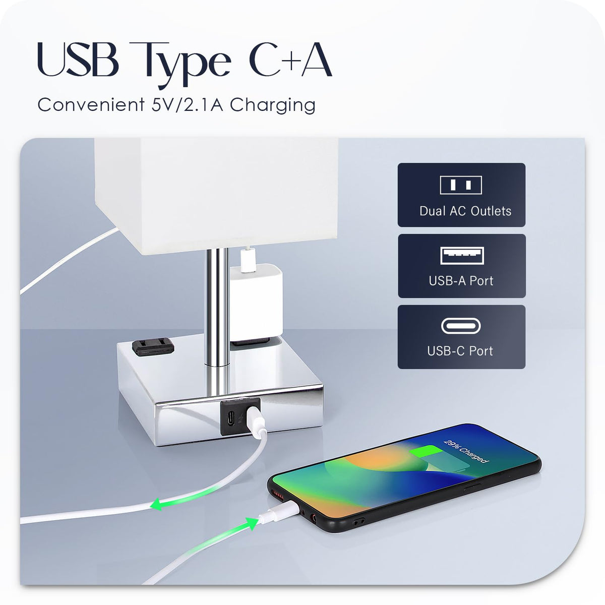 - **USB C+A and AC Outlets**: These innovative bedside lamps are not just for illumination; they also feature a USB C and USB A (5V/2.1A) port along with two AC outlets (120V). Charge your devices conveniently right from your nightstand or side table, eliminating the need for additional chargers cluttering your space.