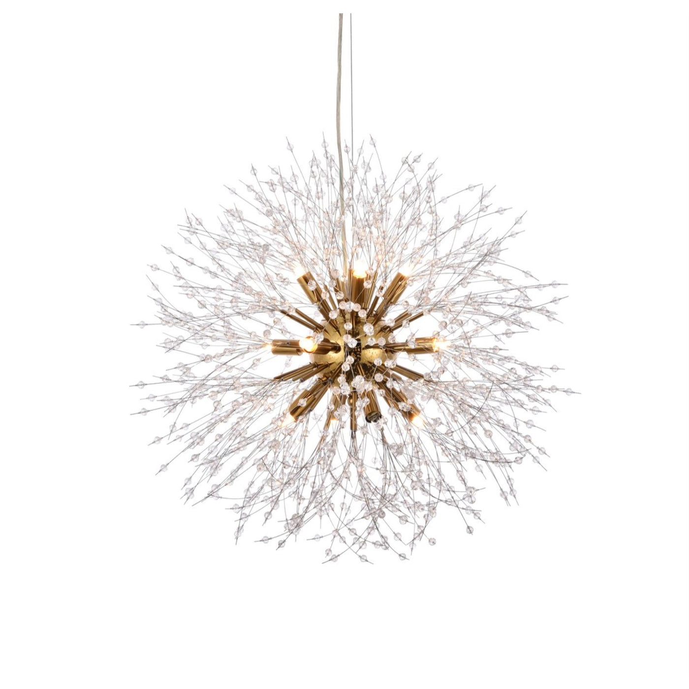Solace collection features clear crystal beads strung on thin chome wires bursting from the center. The modern pendant is an eye-catching design that embellished with several clear crystals transforming the luminous globe to a work of art. Make a statement or set the mood in your living room, dining room, or foyer with this gorgeous style.