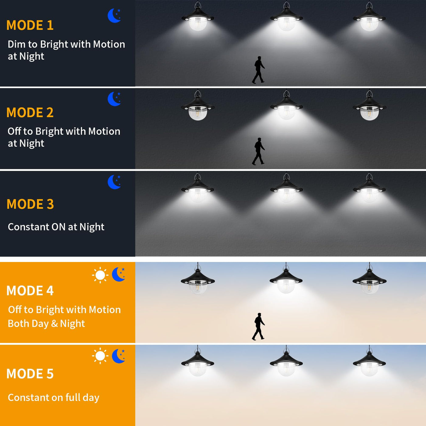 Q: What lighting modes do the Solar Barn Lights offer?A: The lights offer multiple modes, including Always On for continuous illumination and Motion-triggered mode for energy efficiency. This allows you to customize your lighting experience based on your needs.