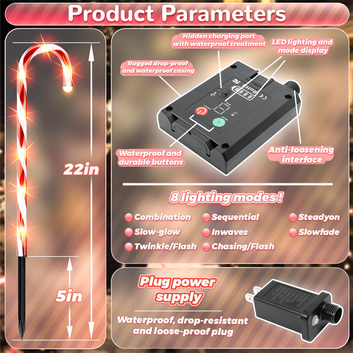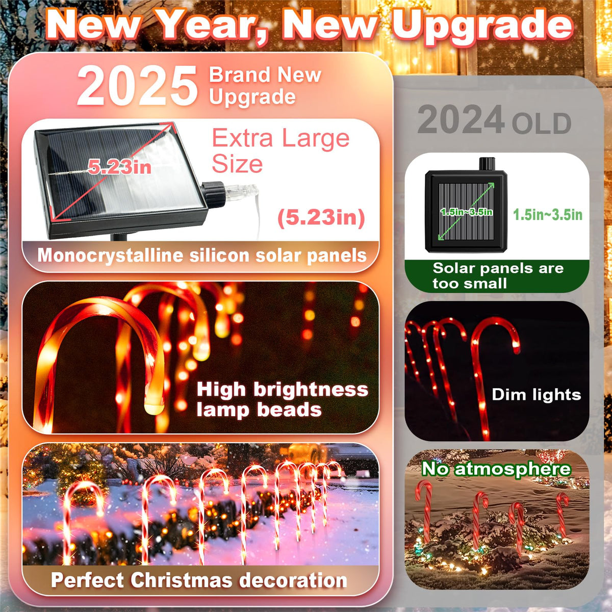 Anordsem This Solar Powered Christmas Candy Cane Decorative Light Is A Creative Product Designed For Outdoor Landscape Lighting. It Combines Solar Technology With Fashionable Christmas Design Elements To Bring A Festive And Joyful Atmosphere To Homes And Public Places, Especially Suitable For Outdoor Spaces Such As Paths, Gardens And Courtyards. Main Features: High-Efficiency Solar Energy: Utilizes Solar Panels To Collect Sunlight And Convert It Into Electricity, Which Is Energy-Saving And Environmentally Friendly, And Reduces The Dependence On Traditional Power Sources Automatic Light Sensitivity: Built-In Photosensitive Sensor, Automatically Turns Off During The Day And Lights Up At Night, No Need To Operate Manually Long-Lasting Battery Life: High-Performance Battery, Even In Continuous Cloudy And Rainy Days Can Continue To Light Up For Weeks, Eliminating The Trouble Of Frequent Charging Red Candy Cane Design: Unique Red Candy Cane Shape, Full Of Festive Atmosphere, Beautiful And Generous Waterproof &Amp; Durable: Made Of High Quality Material With Good Waterproof Performance, Suitable For Outdoor Use And Long Service Life Multiple Scenario Application: Not Only Suitable For Christmas Decoration, But Also Can Be Used For Other Festivals Or Daily Decoration Needs Applicable People: Festival Lovers: People Who Like To Decorate Their Homes And Courtyards During Christmas To Create A Festive Atmosphere Environmentalists: Environmentally Conscious People Who Prefer To Use Renewable Energy Products Such As Solar Energy Outdoor Activities Enthusiasts: People Who Often Do Outdoor Activities, Such As Camping, Barbecue, Etc., And Need Outdoor Lighting Decoration Diy Enthusiasts: People Who Like To Decorate Their Homes With Their Own Hands And Pursue Personalization And Creativity Application Scene: Family Courtyard: During The Christmas Period, Decorate The Decorative Lights In The Courtyard Next To The Trees, Bushes Or Walking Paths To Create A Cozy Holiday Atmosphere Streets And Neighborhoods: For The Decoration Of Public Areas, Such As The Sides Of The Street, Parks Or Community Entrances, To Increase The Sense Of Festivity Outdoor Places: Use In Campgrounds, Barbecues Or Other Outdoor Places To Provide Lighting And Decorative Effects Commercial Places: For Holiday Decoration In Stores, Restaurants, Hotels And Other Commercial Places To Attract Customers' Attention Campus And Office: Used For Holiday Decoration In Campus And Office, Adding Vitality And Team Cohesion Warm Tips: Please Place The Product In A Sunny Place To Ensure The Solar Panel Is Fully Charged. In Case Of Prolonged Cloudy And Rainy Weather, Please Make Sure The Battery Is Fully Charged To Ensure The Normal Lighting Time. If You Have Any Questions, Please Feel Free To Email Us, We Will Be Happy To Serve You.