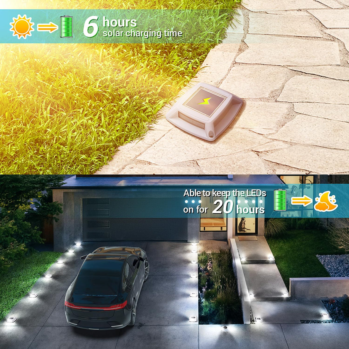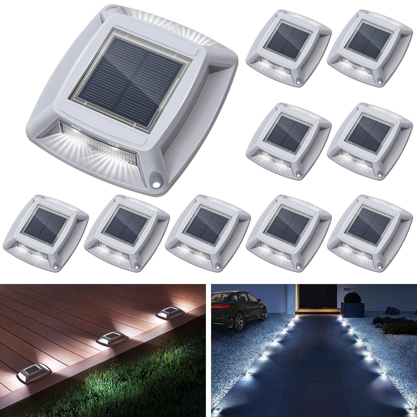 Illuminate Your Outdoors with Etetale Solar Driveway Lights Etetale solar dock lights are the perfect outdoor lighting solution for enhancing the beauty and safety of your home. This 10-pack of solar-powered lights provides reliable illumination for your driveway, deck, garden, walkway, and more. Featuring 4 bright LEDs per light, they serve multiple purposes as driveway marker lights, step warning lights, guiding lights, and decorative outdoor lights. Whether you need functional lighting for your driveway or wish to create an inviting ambiance for your garden or patio, these solar dock lights are your ideal choice. Solar Driveway Lights Specifications: Package Quantity: 10 lights LEDs per Light: 4 bright LEDs Battery Capacity: 600mAh Charging Time: 5-6 hours (in full sunlight) Lighting Time: Up to 20 hours (on full charge) Waterproof Rating: IP68 Materials: POM+PC composite material Weight Capacity: Up to 20 tons Applications: Driveway, Deck, Garden, Patio, Walkway, Pathway, Stairs, Sidewalk, Dock, Marine, and more. Why Choose Etetale Solar Driveway Lights? Energy-Efficient: Powered entirely by solar energy, these dock lights save on electricity costs while contributing to a greener environment. No wiring needed! Durable Construction: Made from POM+PC composite material, these driveway lights are built to last. They can withstand up to 20 tons of pressure, making them perfect for areas with heavy vehicle traffic. All-Season Reliability: With an IP68 waterproof rating and a sealed battery compartment, these dock lights are designed to endure all weather conditions, from rainstorms and snow to extreme heat, ensuring reliable performance throughout the year. Sustainable & Safe: With no external power source required and an automatic on/off feature (thanks to the built-in CDS night sensor), these driveway lights are incredibly convenient and eco-friendly.
