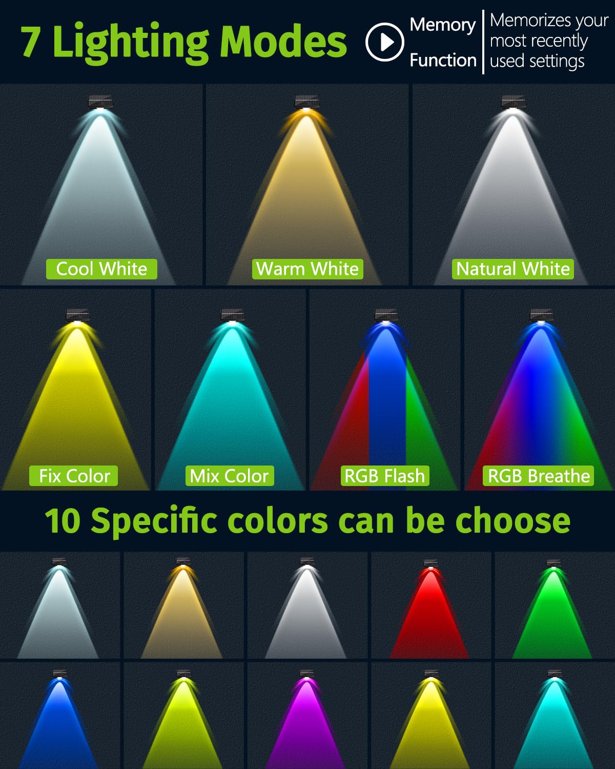 Q: What are the different lighting modes available?A: These solar lights offer 7 versatile modes including cool white, warm white, natural white, fixed color, mixed color, RGB flash, and RGB breathe, allowing you to customize the ambiance of your yard for various occasions.