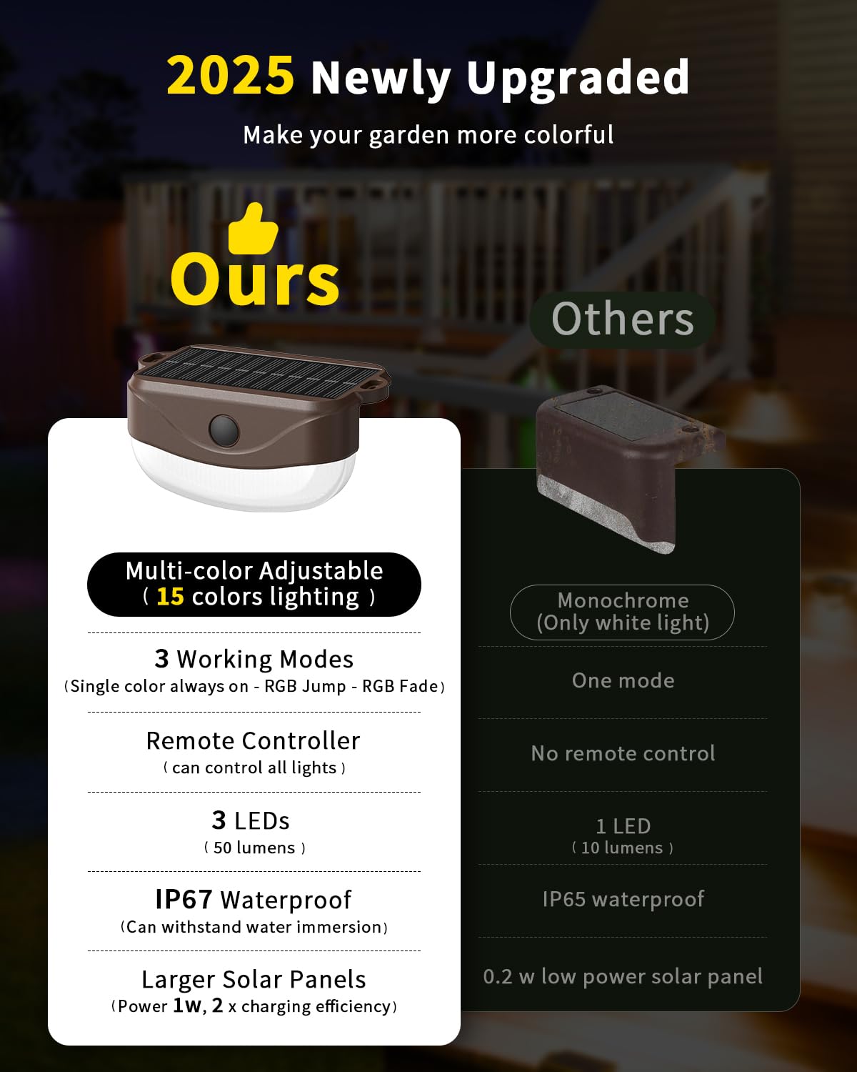The solar light for outdoor can light up every corner of your home This fence light has 2 RGB Color-changing modes(FADE RGBYW & JUMP RGBYW), 3 Color temperatures:Warm Light, Natural Light, White Light(3000K/4000K/6000K), and 12 multi-fixed color lighting. The deck lighting solar powered has 3LEDs LED(RGBYW) Charging in the sun for 4-5 hours, providing 10-20 hours of light. This solar lamp is small in size, but bright enough to meet the installation requirements of different environments. The waterproof level of our solar step light is up to IP67 with hard ABS shell and the high-durability solar panel which is enough to work in any rain,wind and snow weather day. No wires are required, the installation can be completed with a matching screw set in five minutes, or Double-sided tape tape directly pasted on the fence. The solar outdoor Lights can be perfectly applied in a variety of scenarios such as fences, deck railings, steps, stairs, small roads, yards and gardens. Enjoy hassle-free landscape lighting once installed.