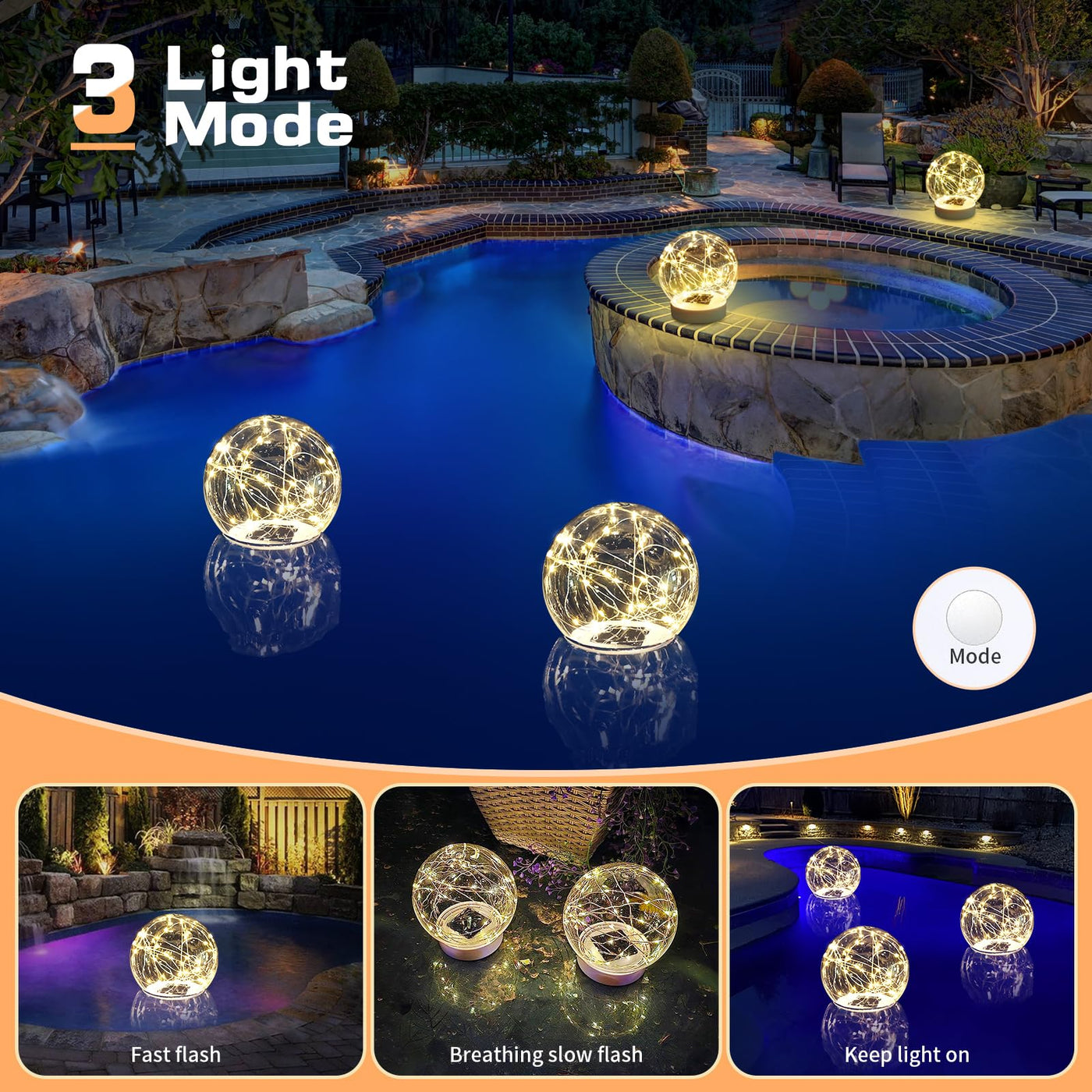 Q: What lighting modes do the solar pool lights offer?A: The solar floating pool lights feature three different lighting modes: fading, flashing, and steady lights. You can easily switch between them using the buttons located on the bottom of the lights.