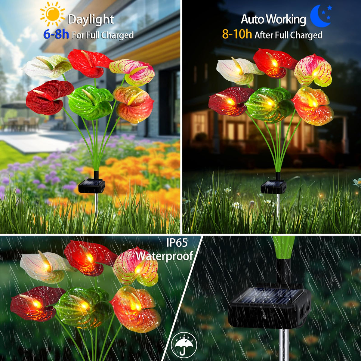 Designed to resemble blooming red anthurium flower, made with high-quality, fade-resistant simulated flower materials. Unlike other sparse and dim solar flowers, each solar flower lights has six stems and leaves,with lifelike red anthurium flowers, along with bright warm led lights.