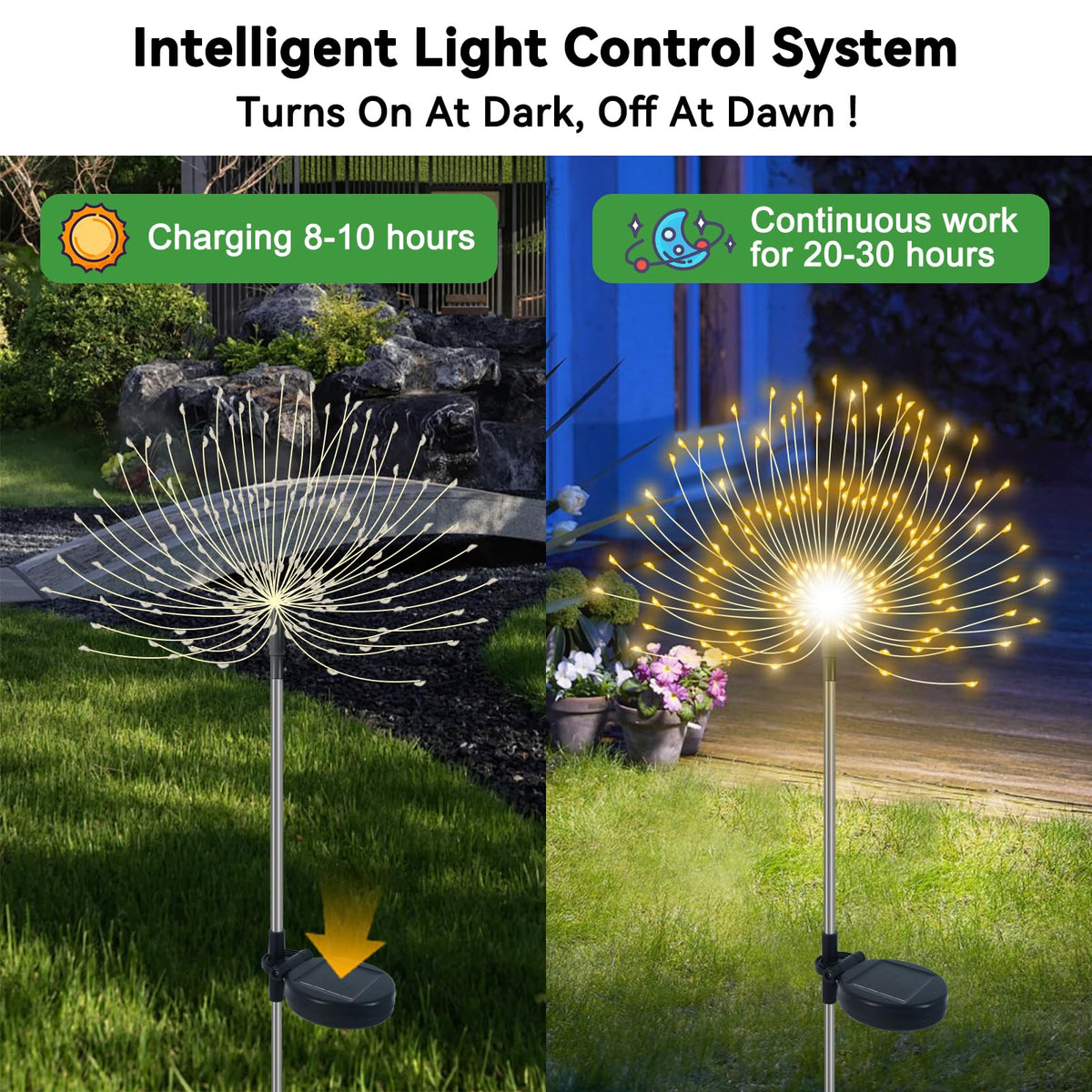 ?120 LED Solar Lights for Outside: Our upgraded creative solar garden fireworks lights have 120 LED beads, more beautiful and brighter than the other fireworks lights with 105 beads. You can DIY any shape as you like to creat a beautiful and colorful light spots lifelike fireworks, lighting up your beautiful garden, yard, sidewalk, etc.