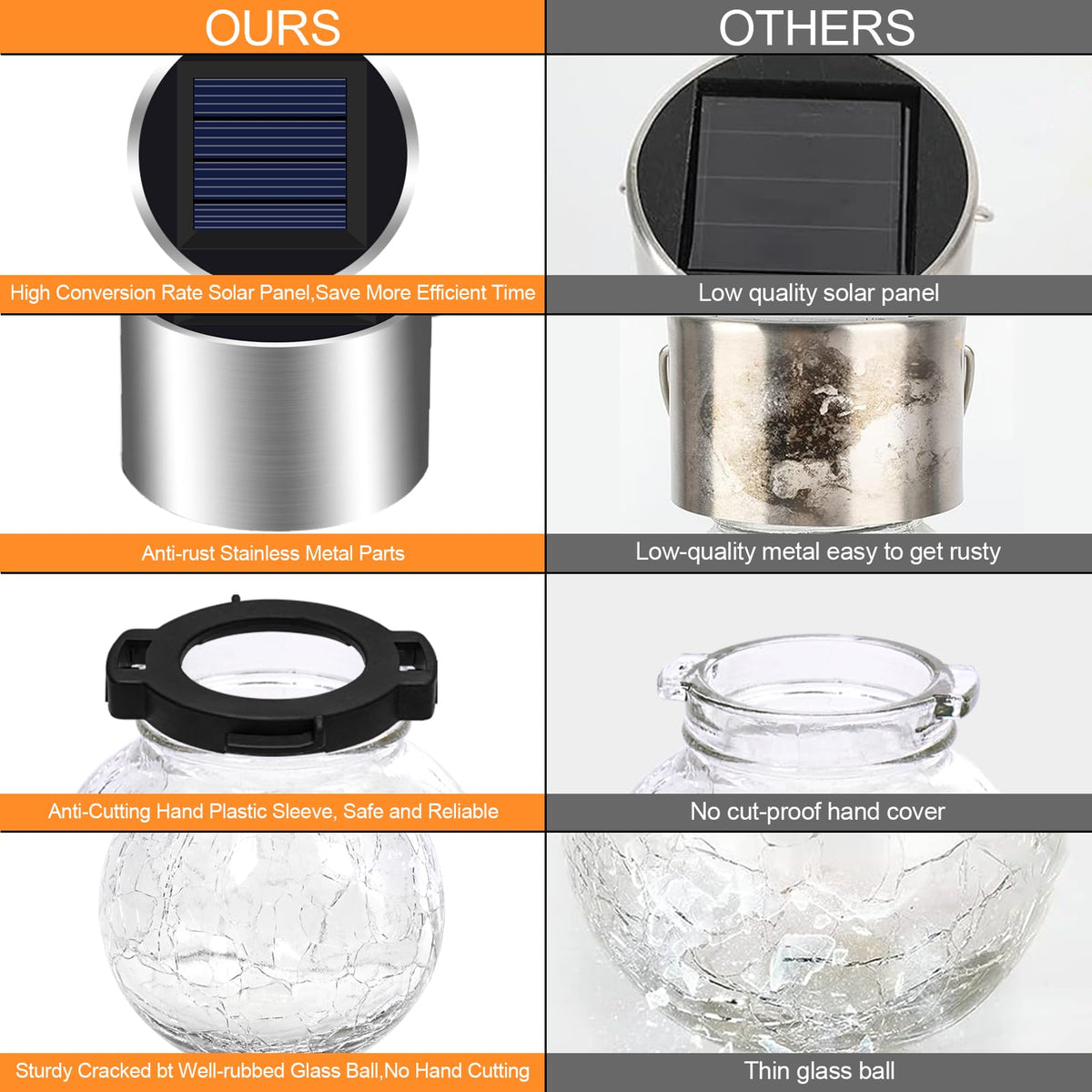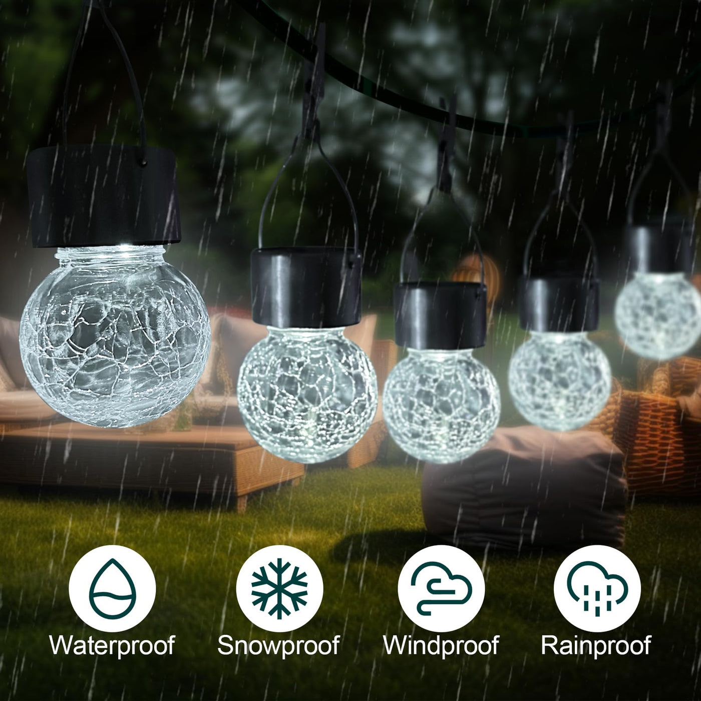 Q: What materials are the solar hanging lights made of?A: The solar hanging lights are crafted from premium thick crackle glass, ensuring they are sturdy and resistant to impacts, while the stainless steel hooks and clips prevent rust and provide a secure attachment.