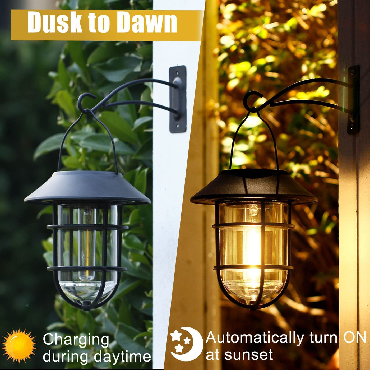 Solar Lantern Outdoor Hanging Solar Lights, Waterproof Metal Solar Outdoor Lights With Clear Glass, Led Edison Bulbs Decorative Wall Lantern With Hooks, No Wiring Required, 2 Pack