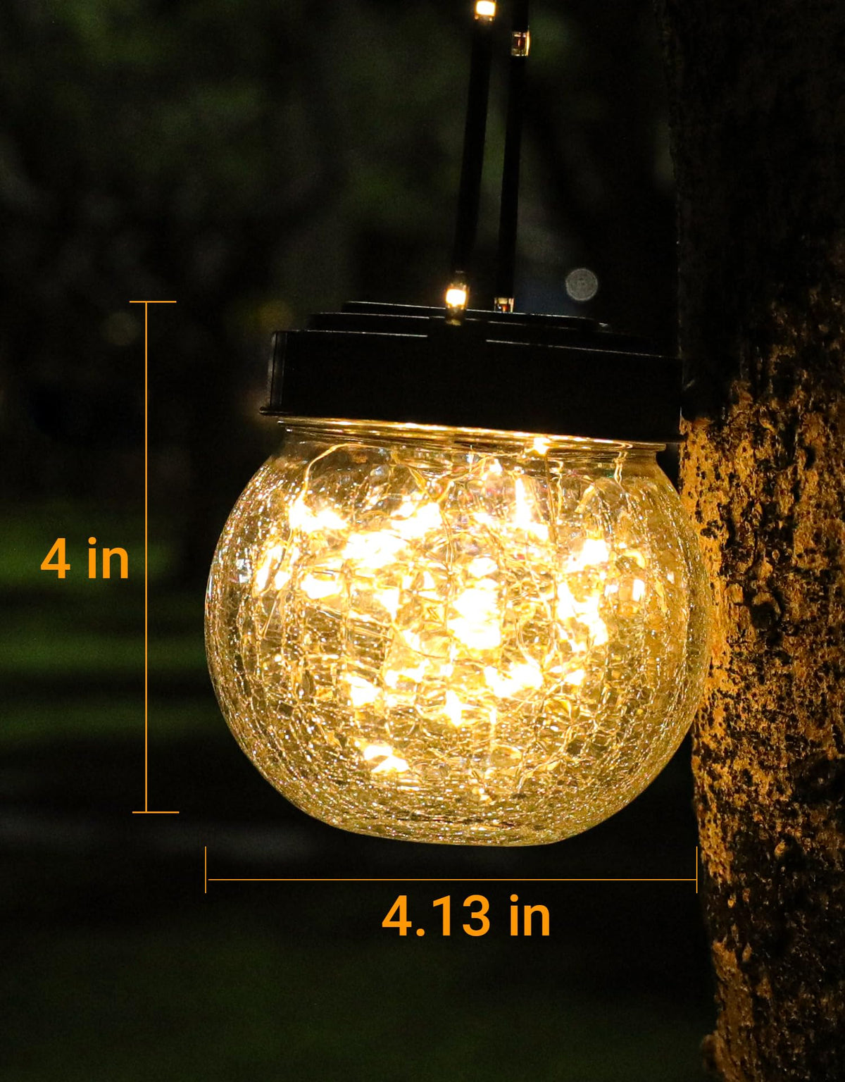 Q: What is the size of the solar lanterns and how can they be displayed?A: The solar lanterns come in a large globe size measuring 4 inches in diameter and 4.3 inches in height. They can be hung on a shepherd hook or tree, and they also create beautiful crack patterns when placed on tables or the ground.