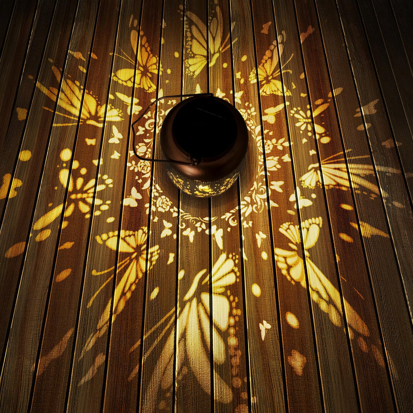 Q: What are the key features of the Solar Lantern for outdoor use?A: The Solar Lantern features a retro design with a gold copper color and hollow out metal veneer, casting bright and warm light with beautiful butterfly patterns. It is waterproof with an IP65 rating, making it suitable for outdoor conditions.